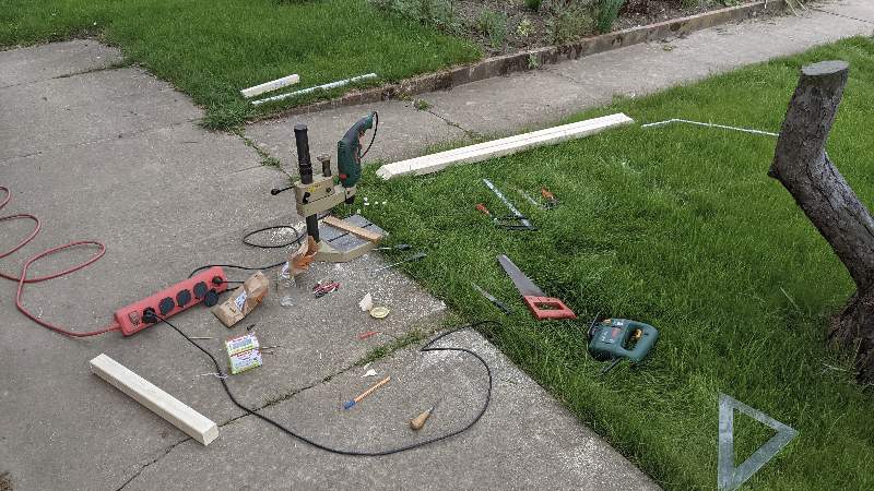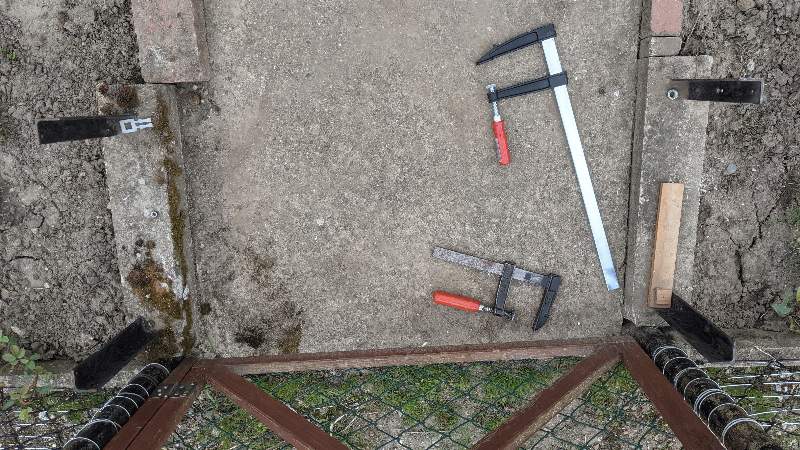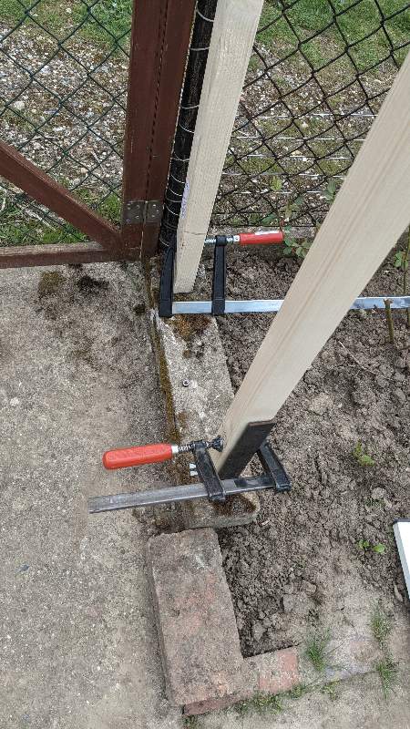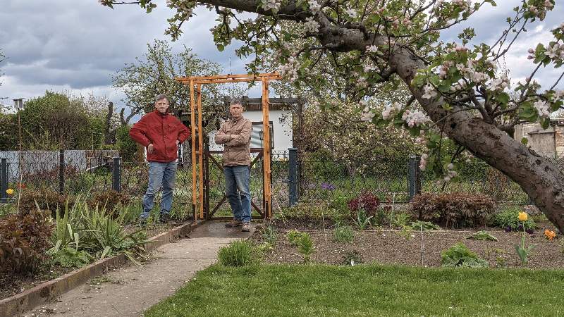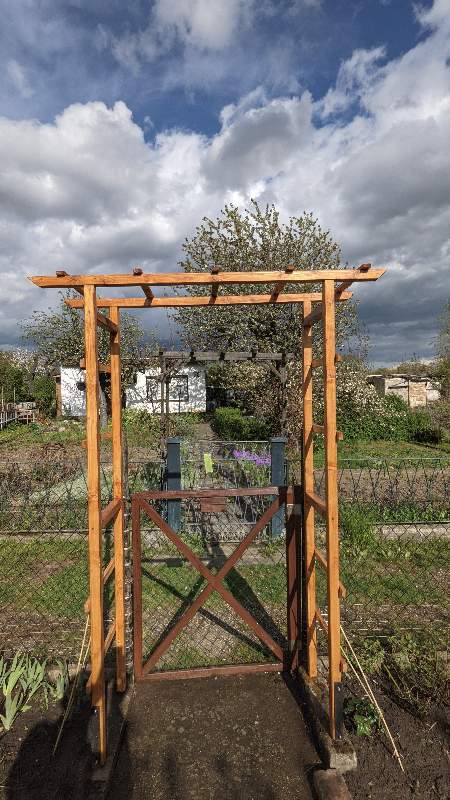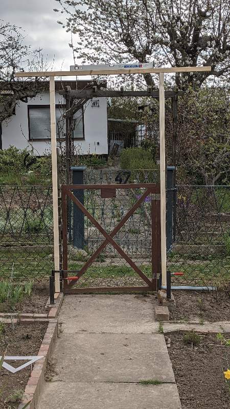2020 enstand die Idee, ein Rosenspalier über dem Eingang zum Garten 26 zu errichten. Dazu sollten die von Bernard bereits gesetzten Fundamente mit eingelassenen Winkeleisen genutzt werden. Somit entschied eine Kauflösung aus. Wir konnten bislang leider nicht klären, ob am Gartentor 26 in früheren Zeiten ein Rosenbogen vorhanden war.