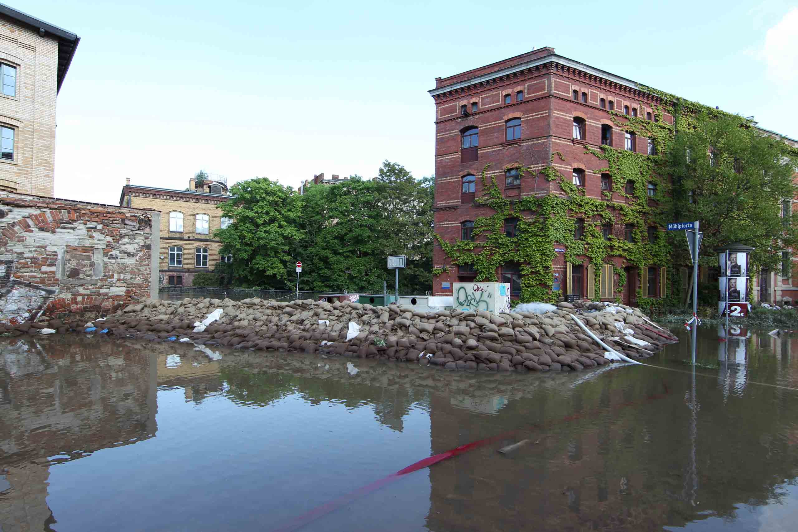 Hunderte eingesetzte Einsatzkräfte und Tausende freiwillige Helfer kämpften hier gegen Wasseraustritte. Währenddessen fiel eine Pumpstation aus. Die Evakuierung soll insgesamt knapp 30.000 Einwohner betreffen. Auch Teile der Innenstadt, besonders die unter Wasser stehende Klaustorvorstadt und der Ratswerder waren von der Evakuierung und Sperrungen betroffen. Der höchste Pegelstand am 5. Juni war 8,10 Meter. Damit wurde die bisherige Höchstmarke der Saale von 7,00 m vom 15. März 1947 deutlich übertroffen. (Quelle: Wikipedia)