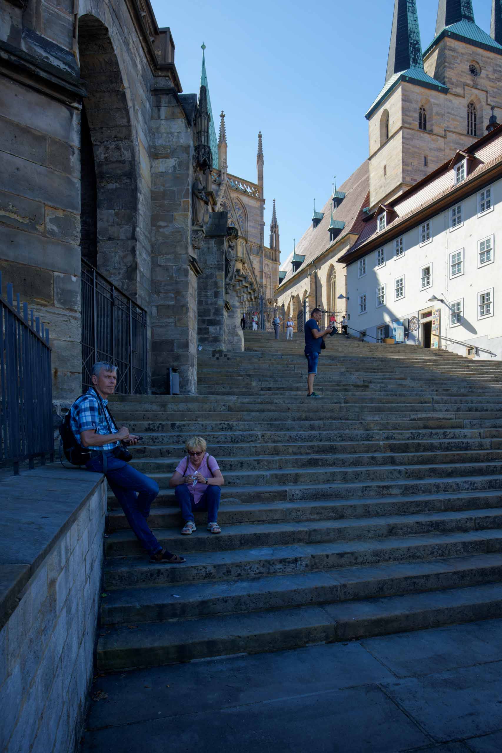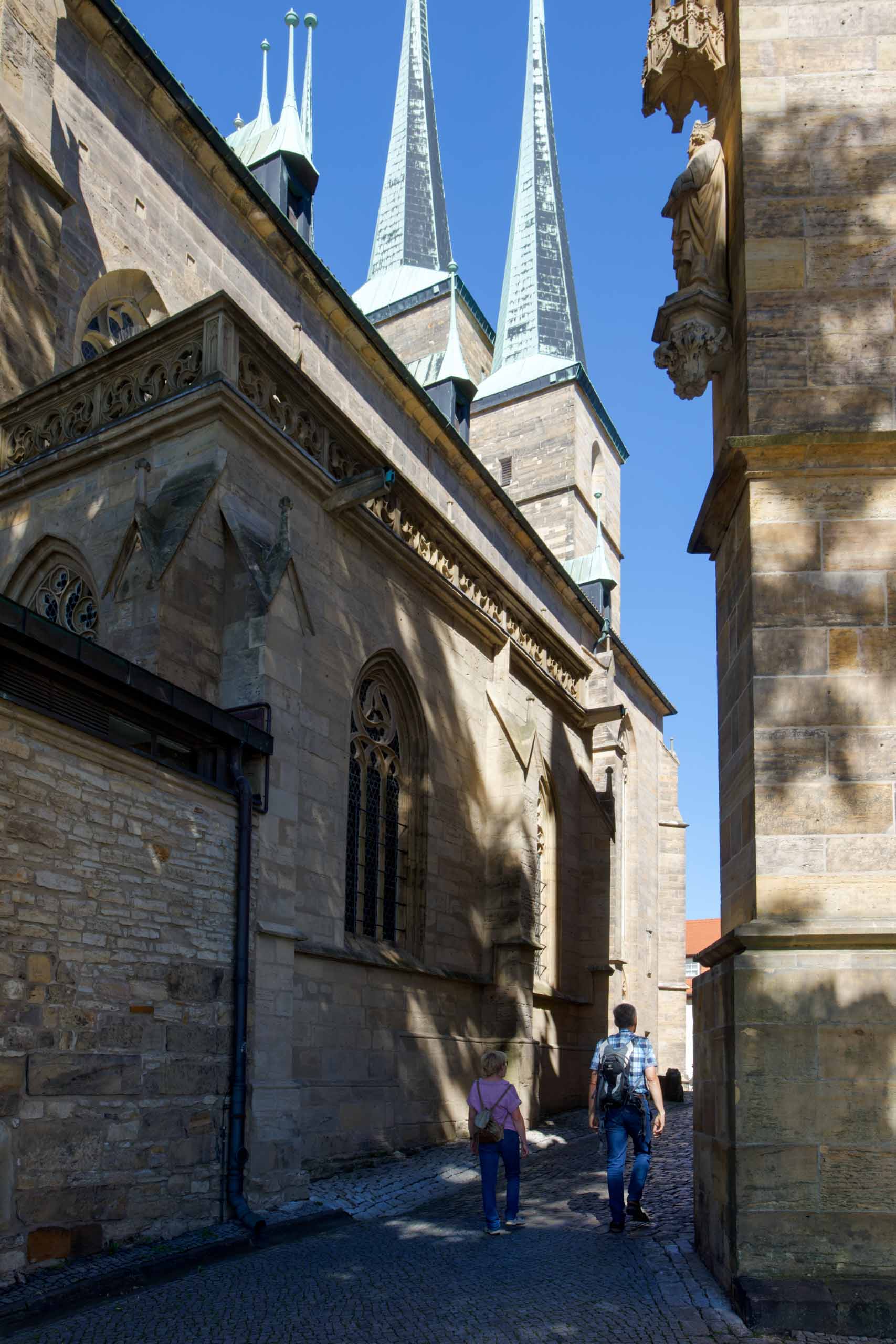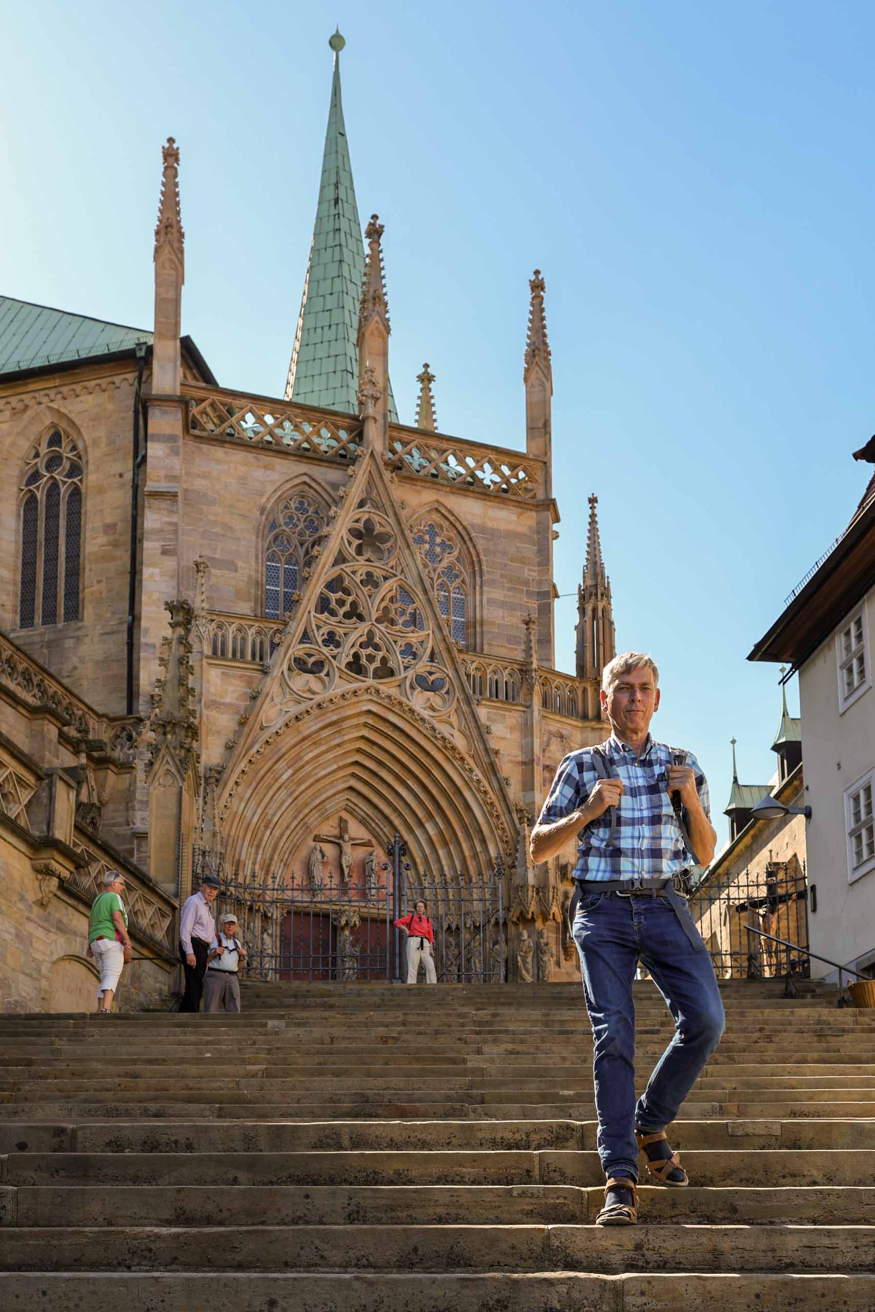 Im Zentrum Erfurts haben wir noch den Dom und dessen Umgebung besucht, bevor wir mit beiden Schönstedtern den Petersberg erklommen. Von dort hatten wir einen wunderbaren Ausblick auf die Stadt und ins Umland, sogar den Glockenturm auf dem Ettersberg bei Buchenwald konnte man erkennen.
