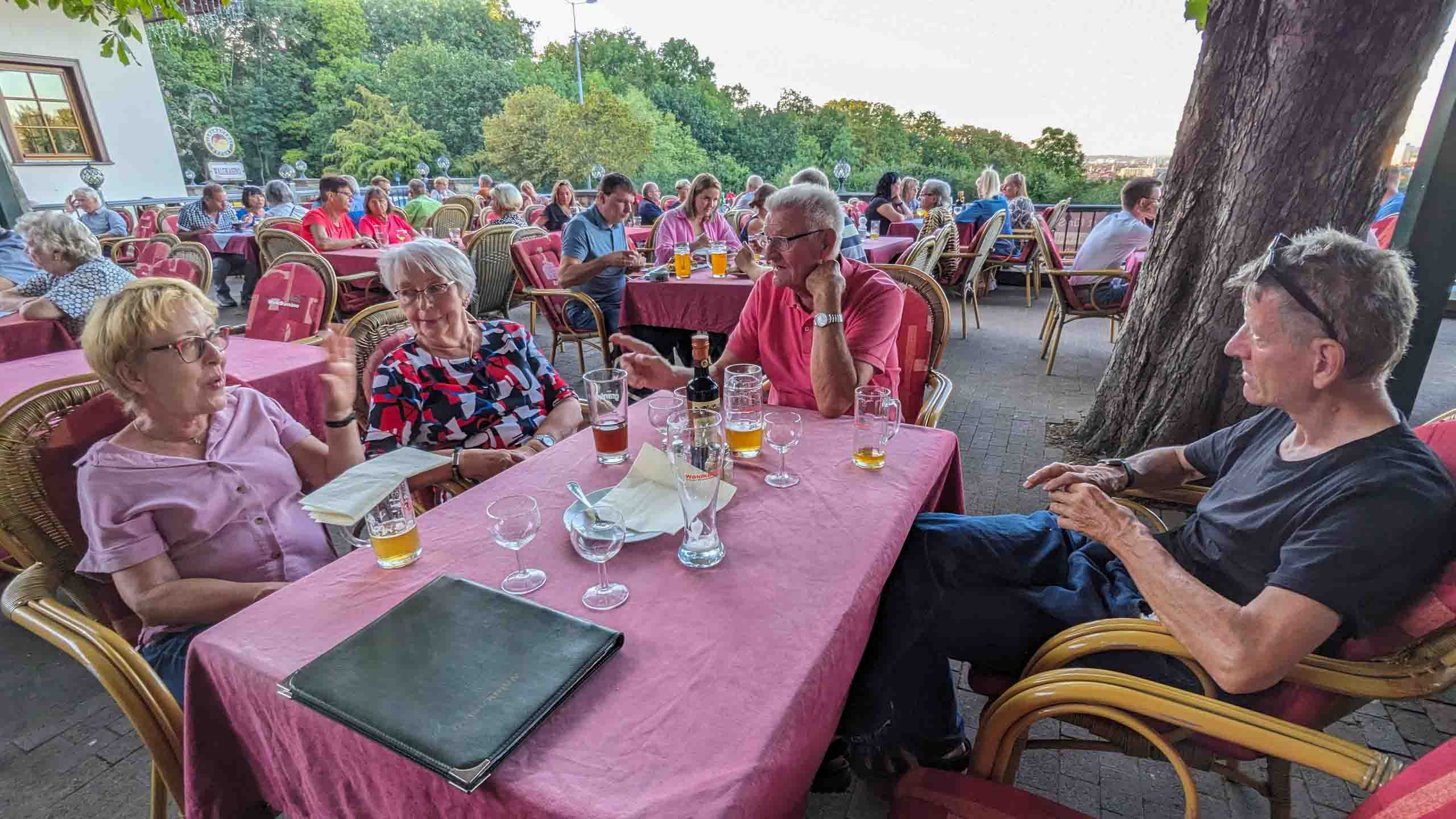 Nach dem sehr schönen Stadtspaziergang mit einem leckeren Eiskaffee ging es noch an den Stadtrand von Erfurt ins Waldkasino (unbedingt merken!). Dort herrschte ein enormer Andrang (Mittwoch abend) aber der Oberkellner fand noch schnell einen passenden Tisch im riesigen und sehr vollen Biergarten.