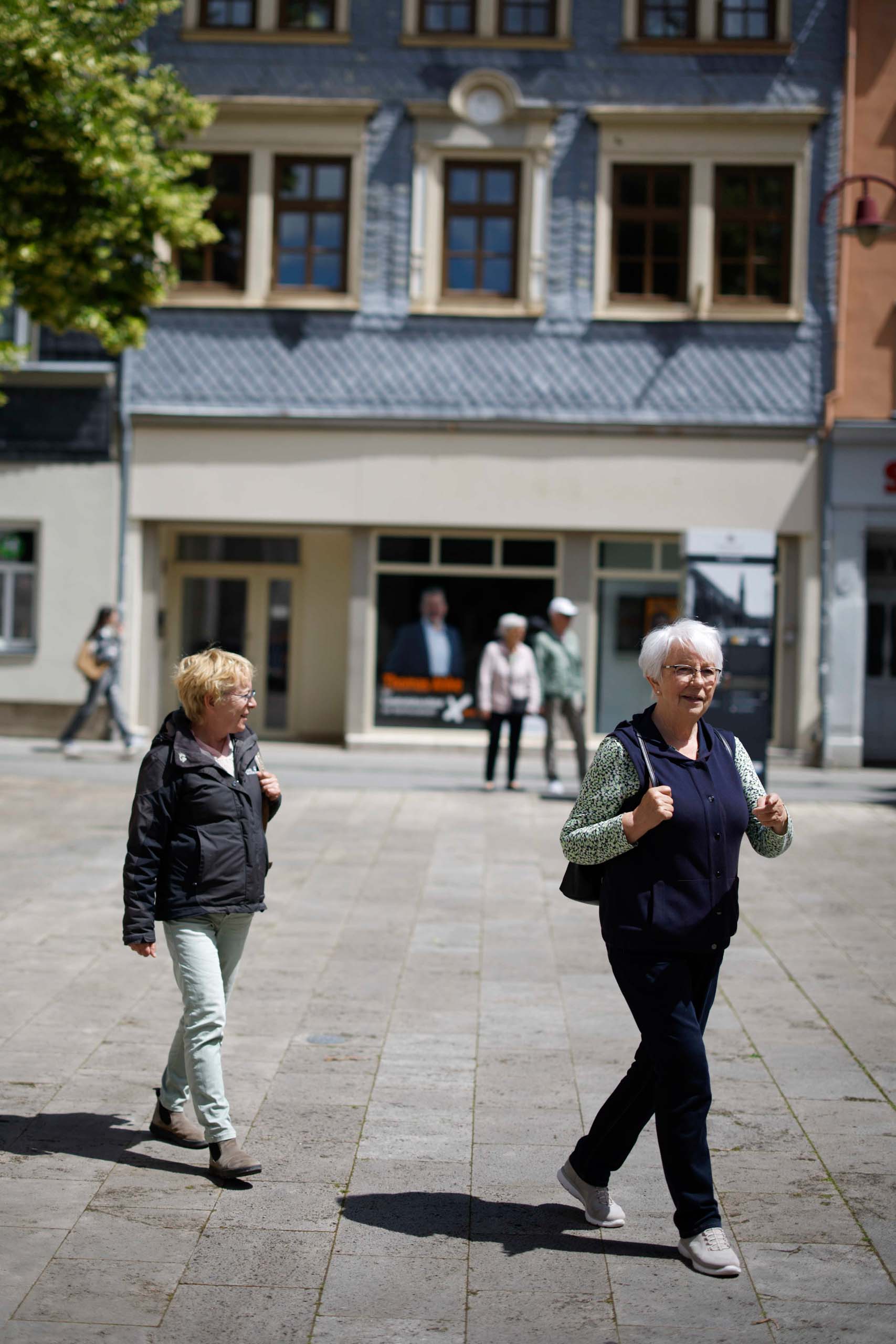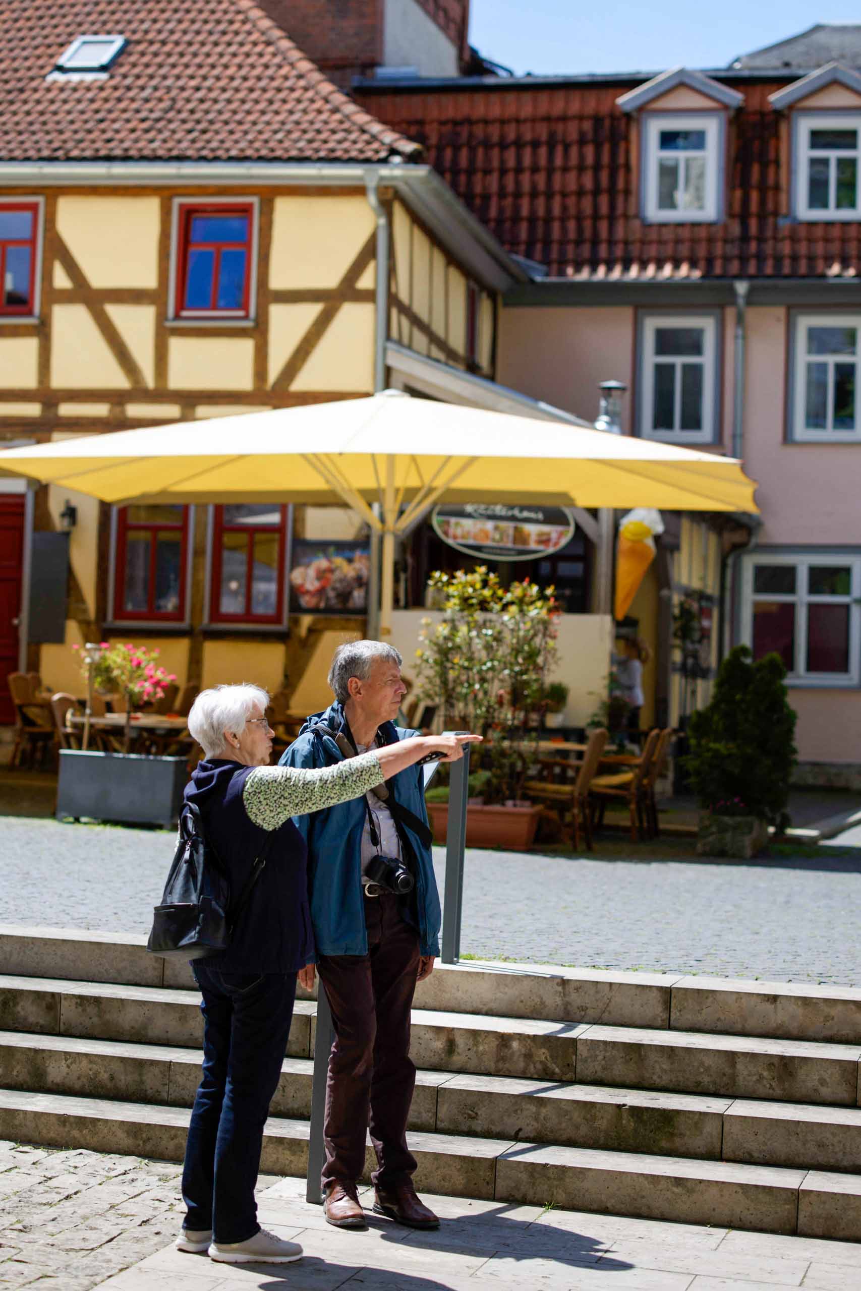 Wir wandern mit Annchen und Heinz durch den Stadtwald zu den Mammut-Bäumen, besuchen das Bratwurst-Museum, schlendern durch Mühlhausen und treffen schließlich Ingrid aus Großengottern im Garten-Café in Schönstedt.