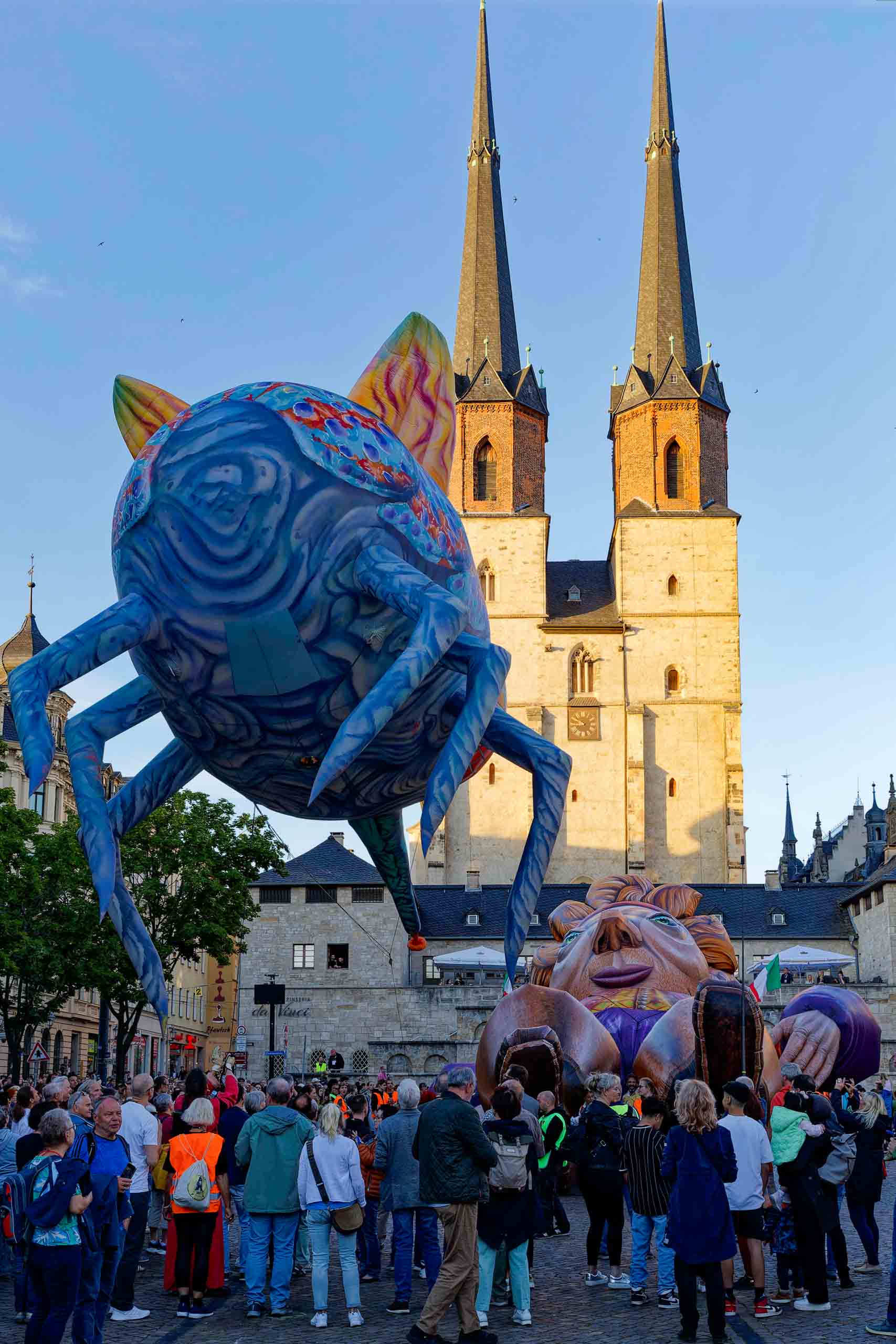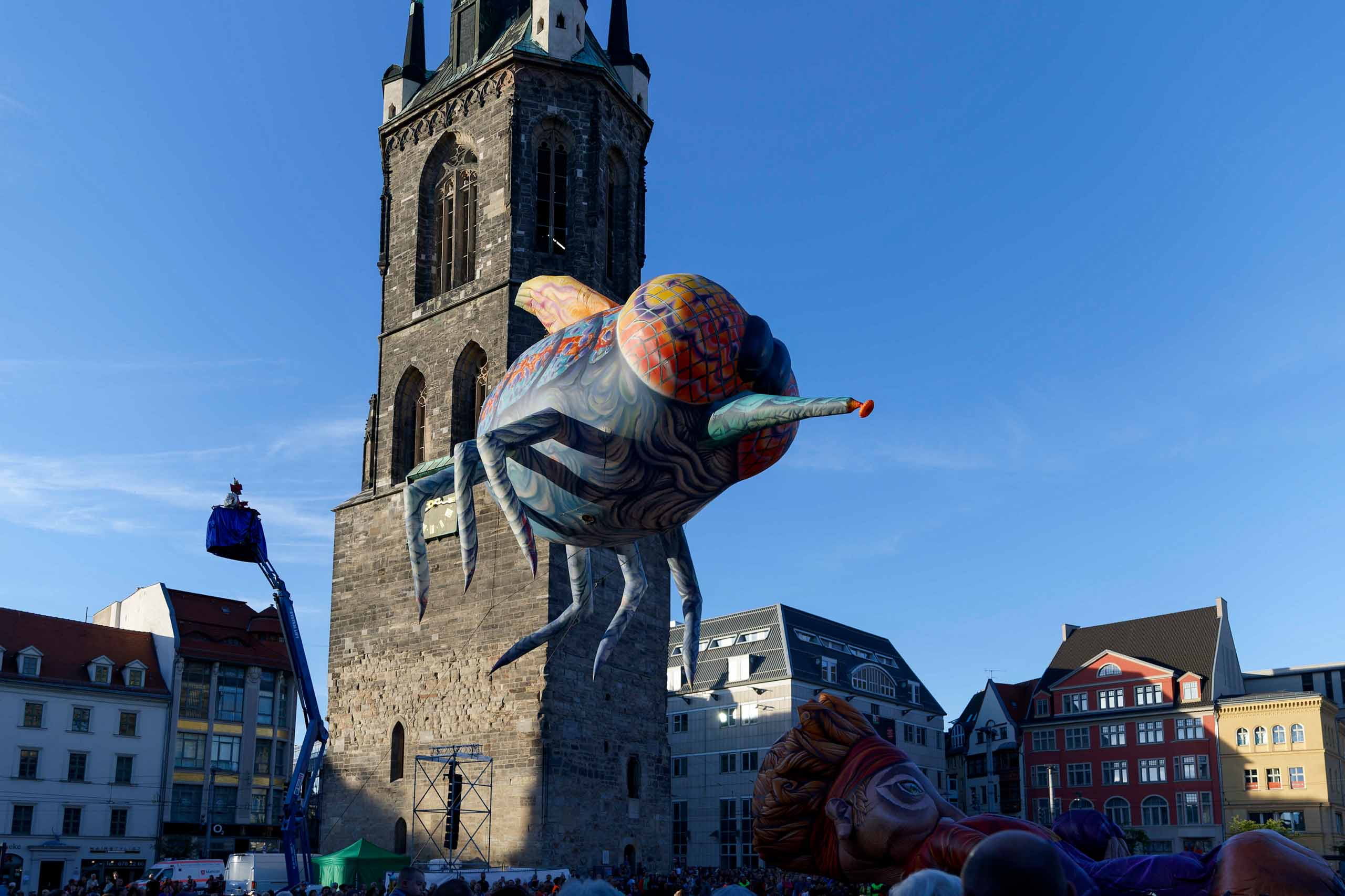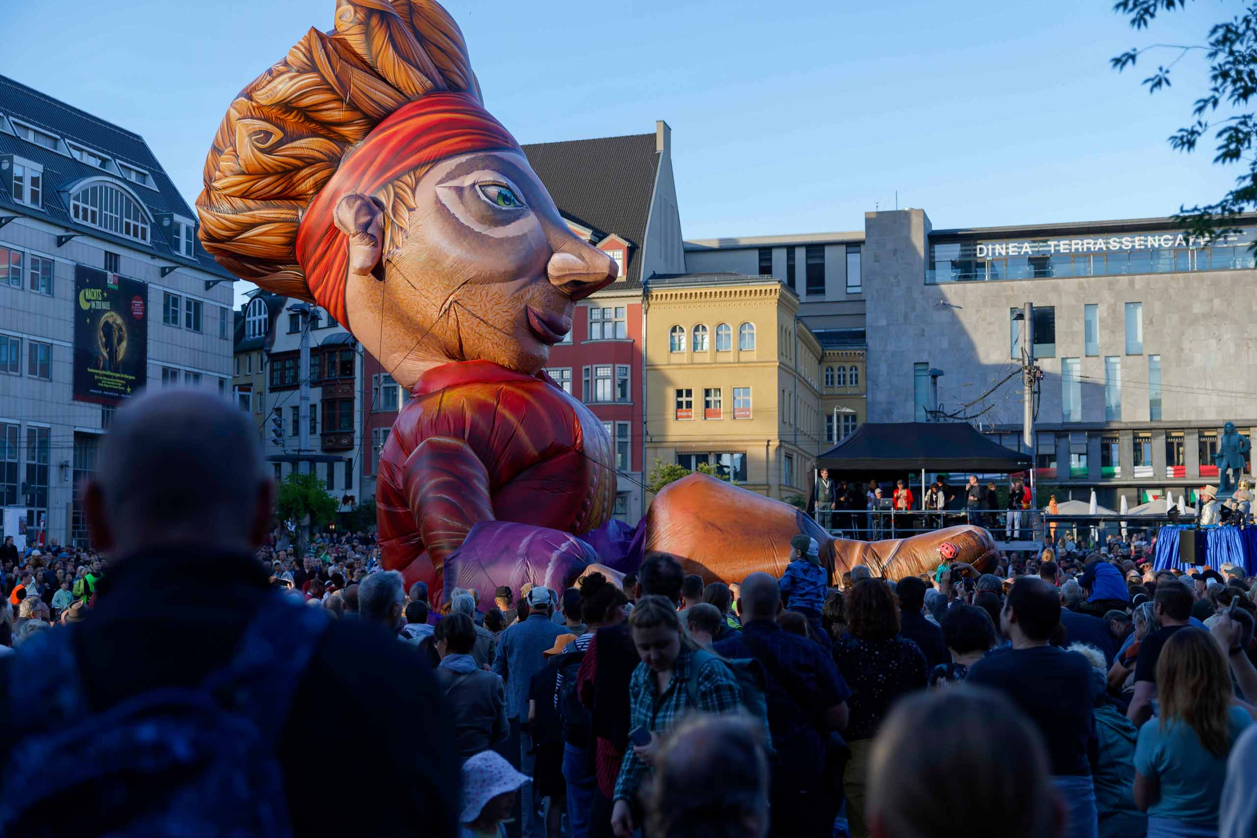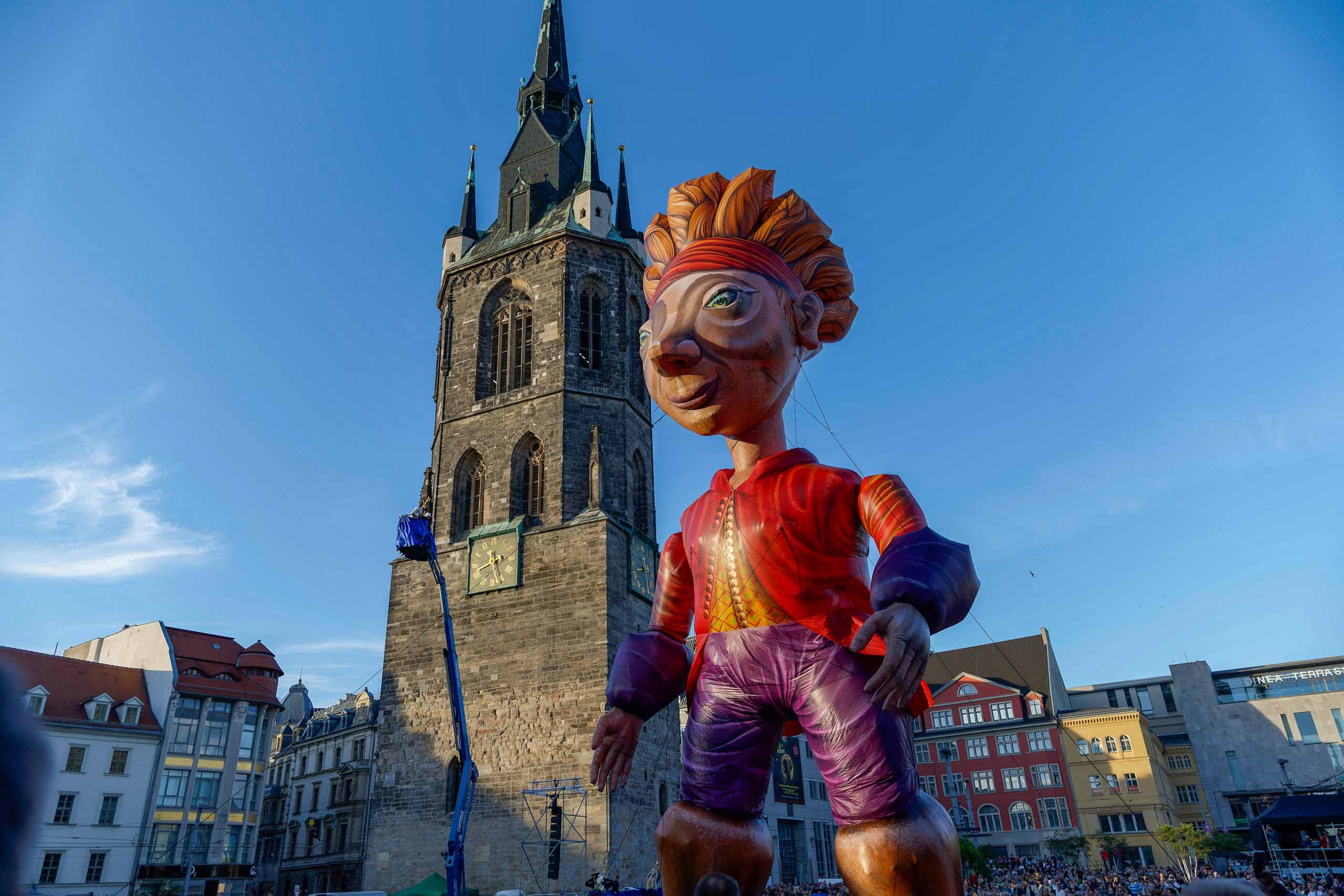 Das Theater Titanick zeigte zum Finale des Gulliver-Festes die spektakuläre Inszenierung "Upside Down", eine 360°-Performance bevor sich Gulliver am Samstag wieder auf dem Marktplatz von seinem Publikum in Halle verabschiedete.