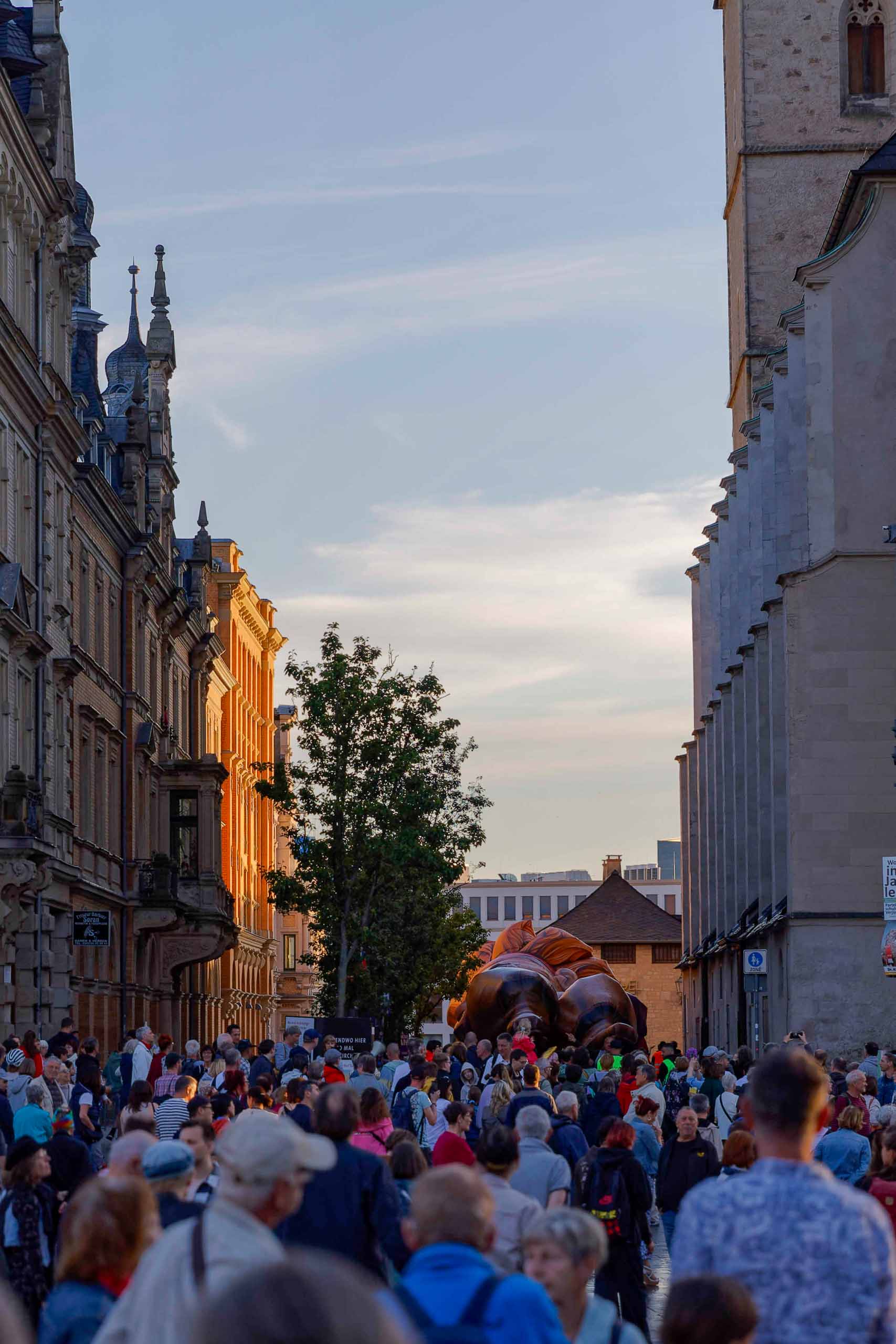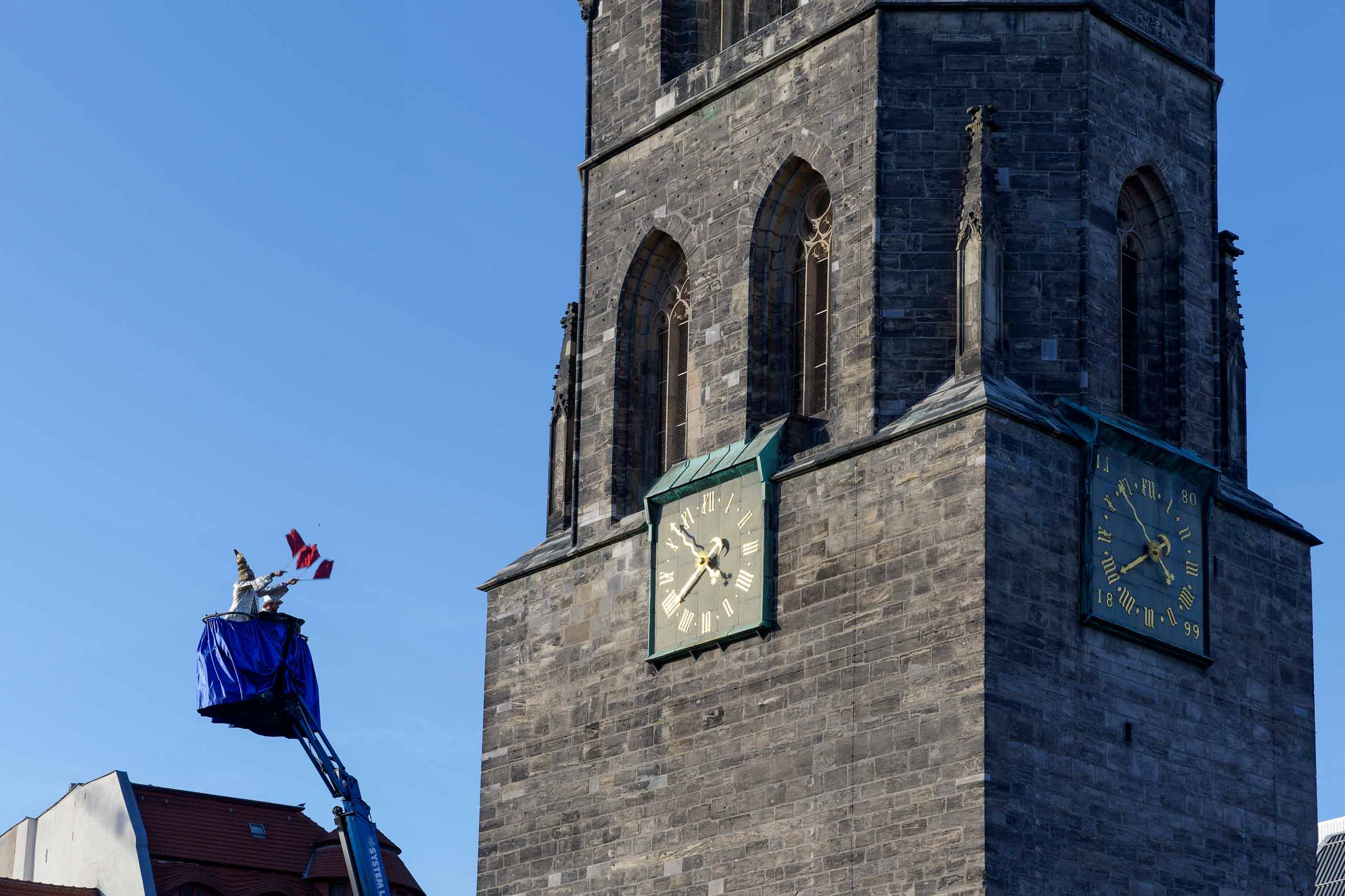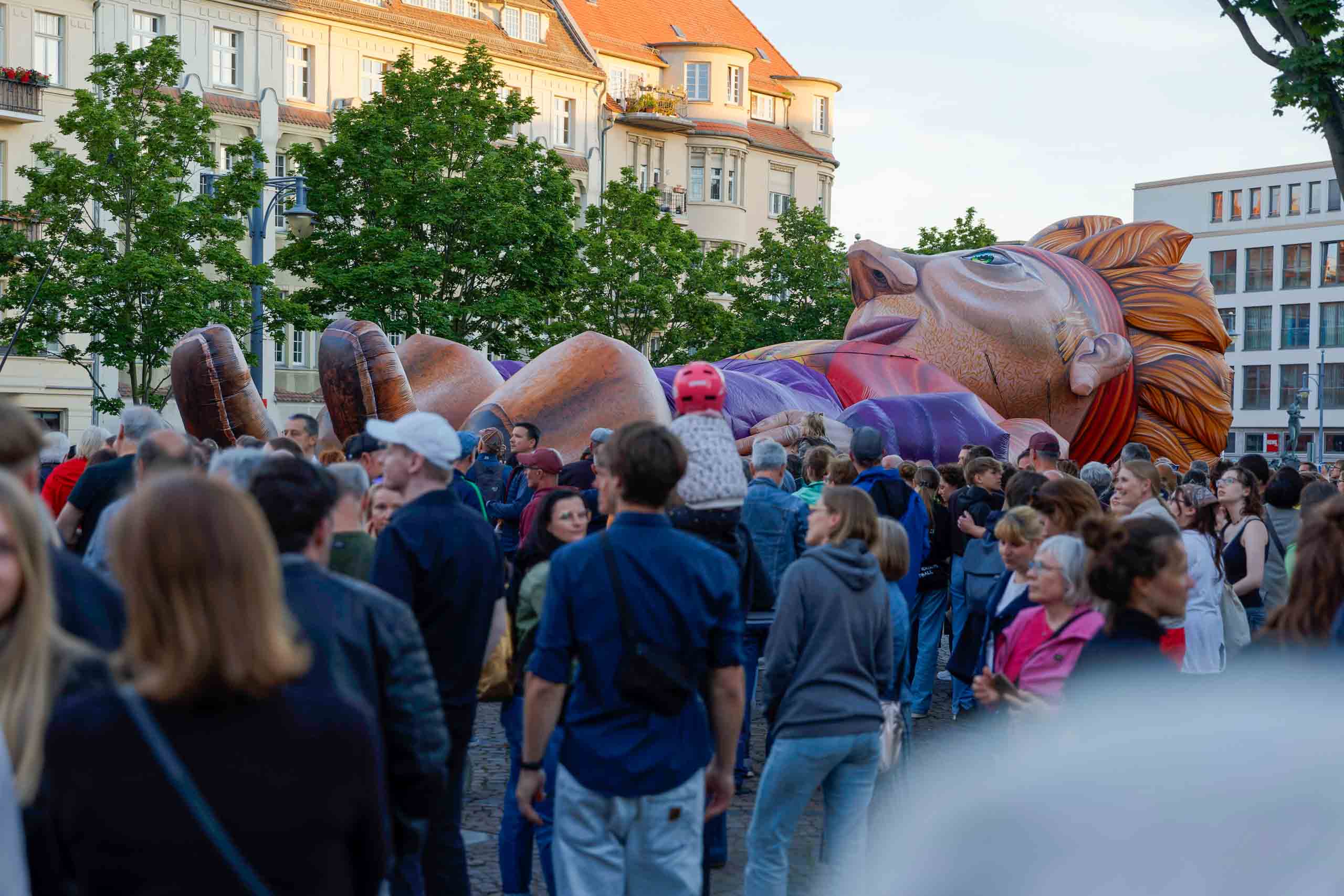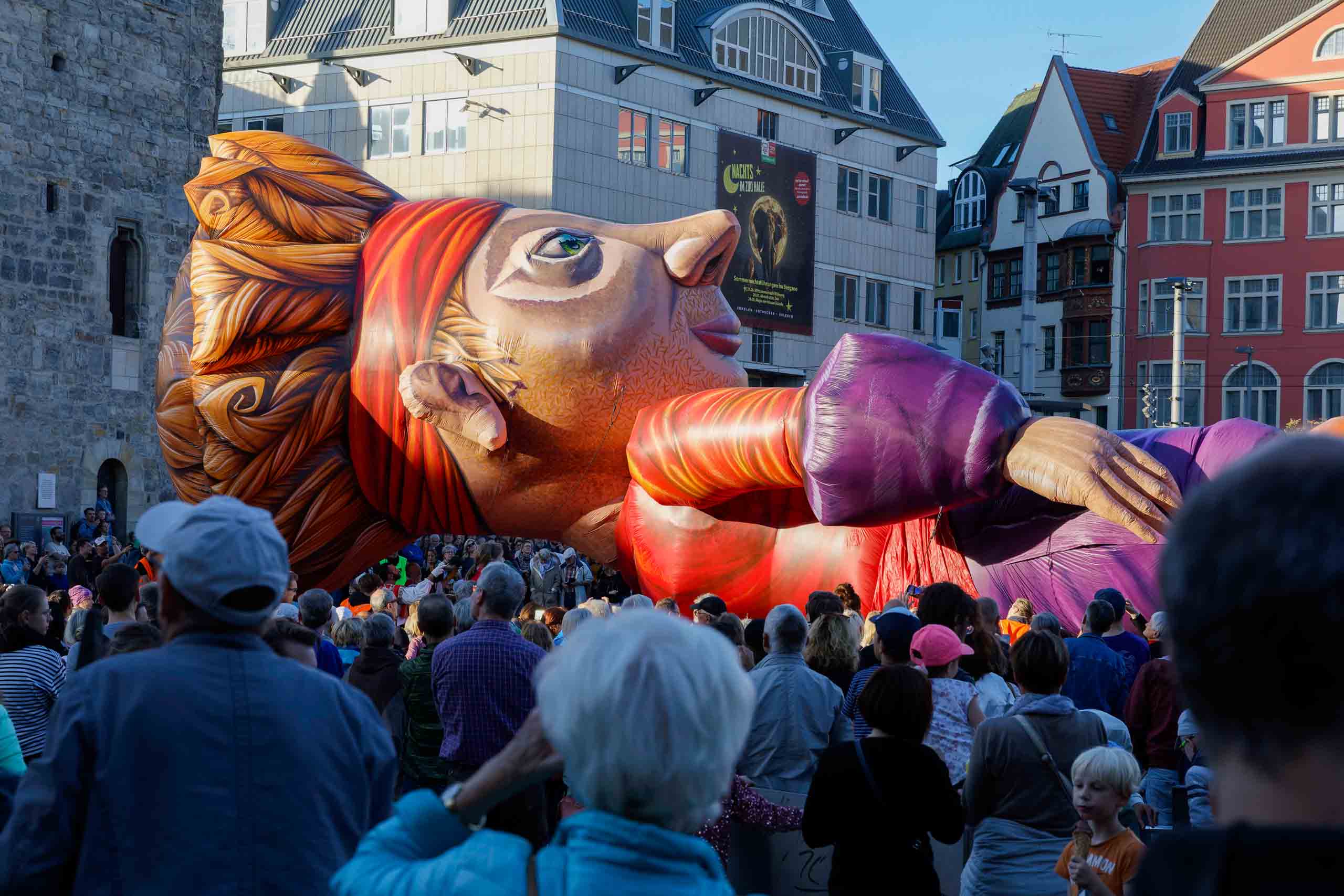 Das Theater Titanick zeigte zum Finale des Gulliver-Festes die spektakuläre Inszenierung "Upside Down", eine 360°-Performance bevor sich Gulliver am Samstag wieder auf dem Marktplatz von seinem Publikum in Halle verabschiedete.