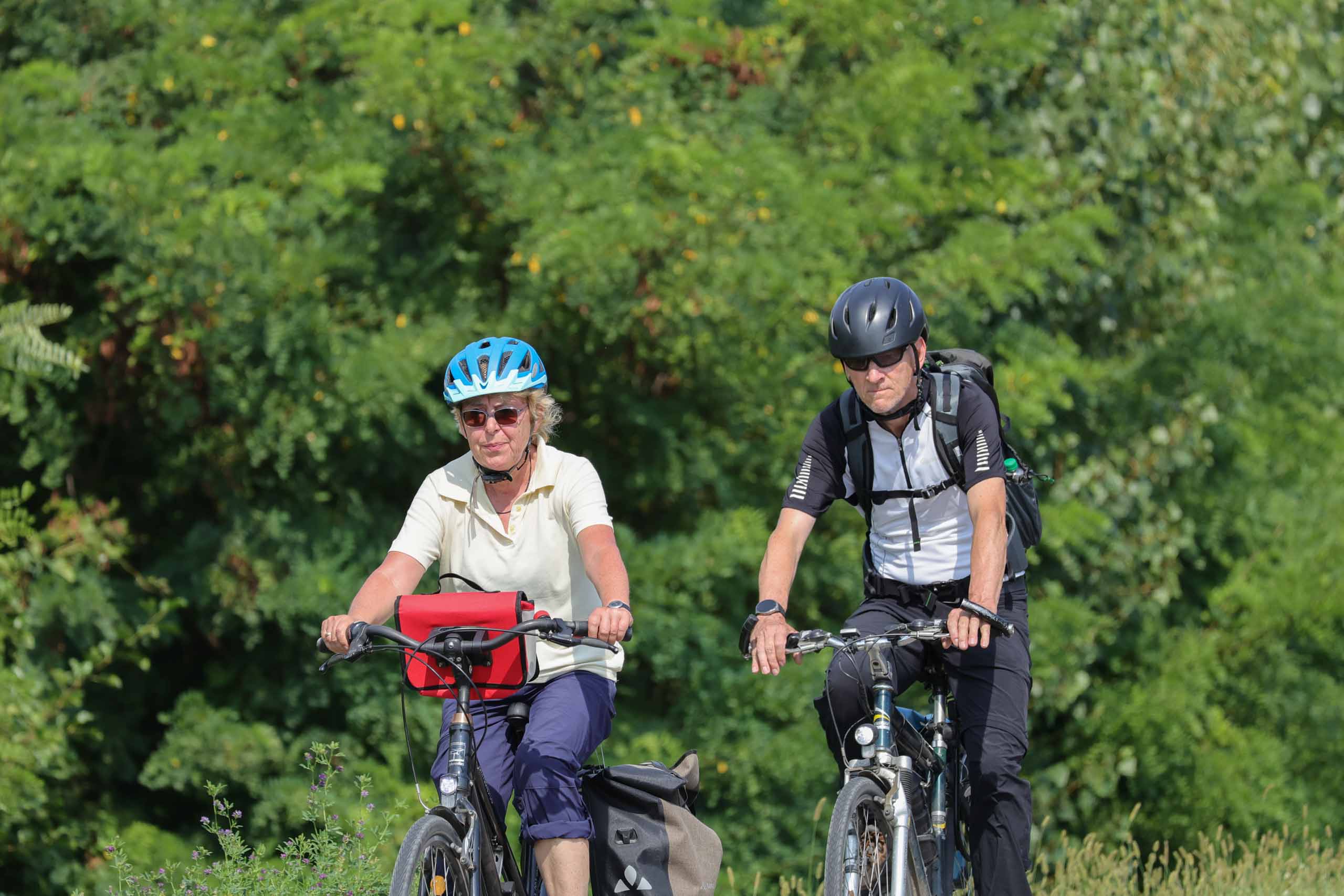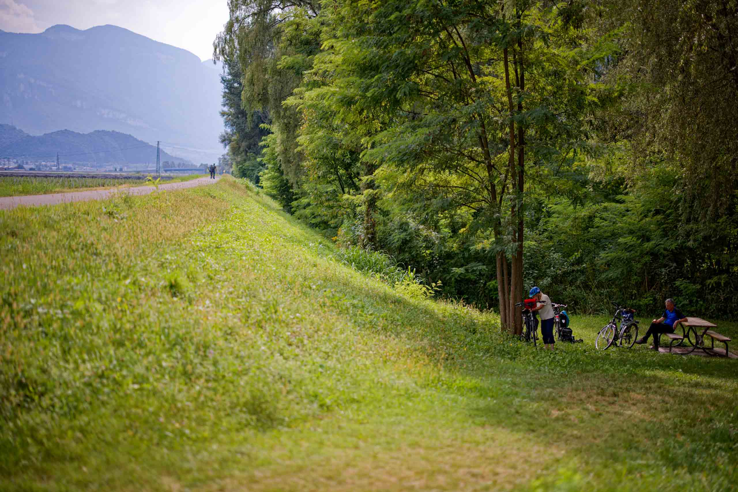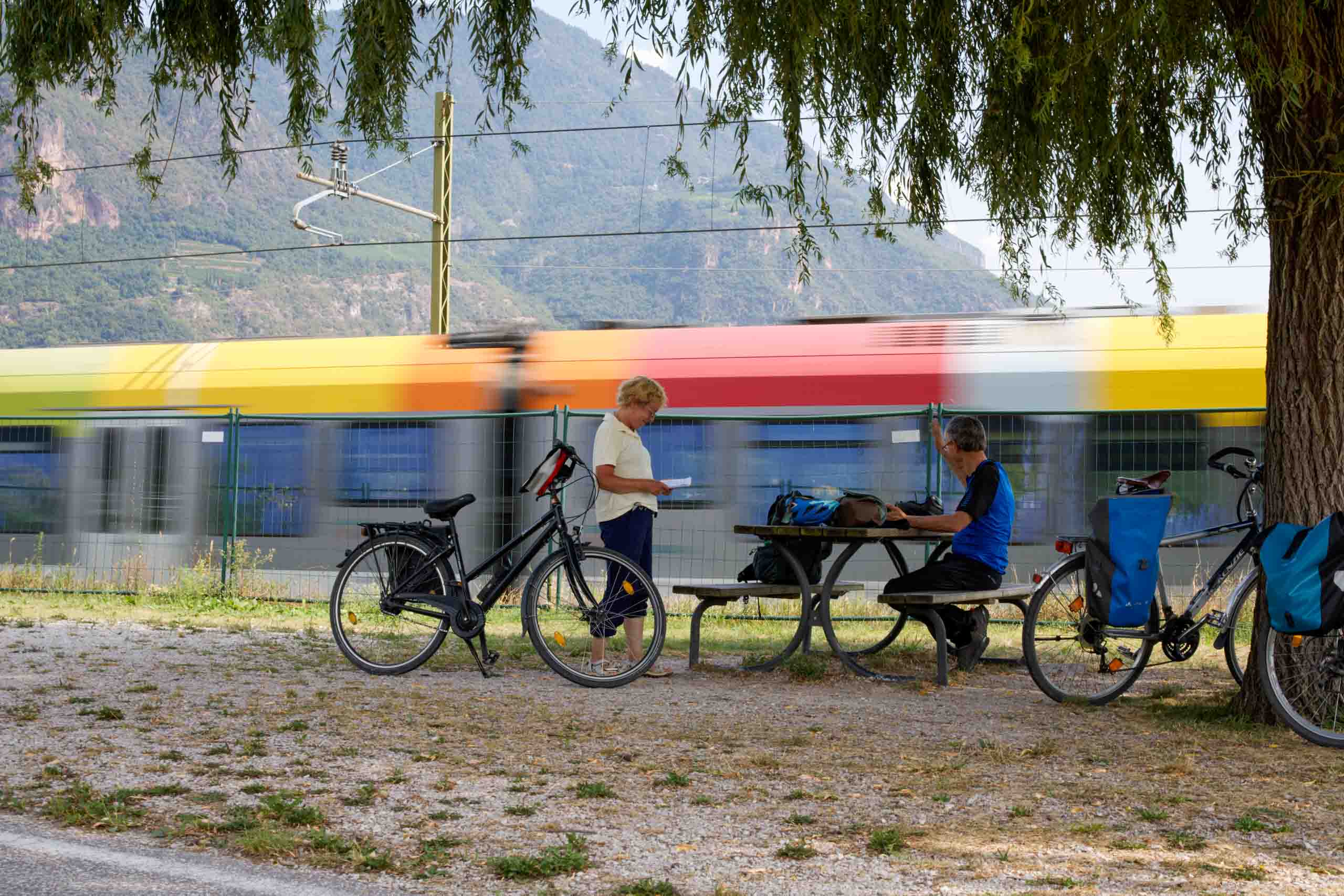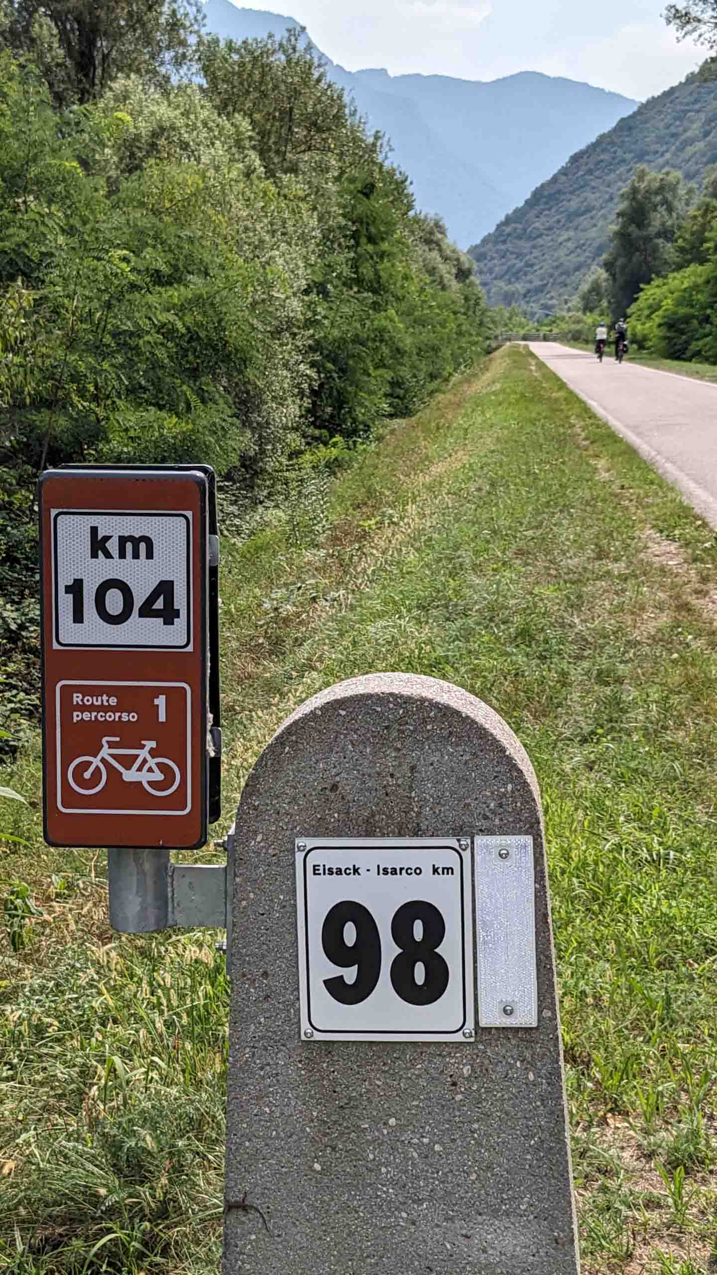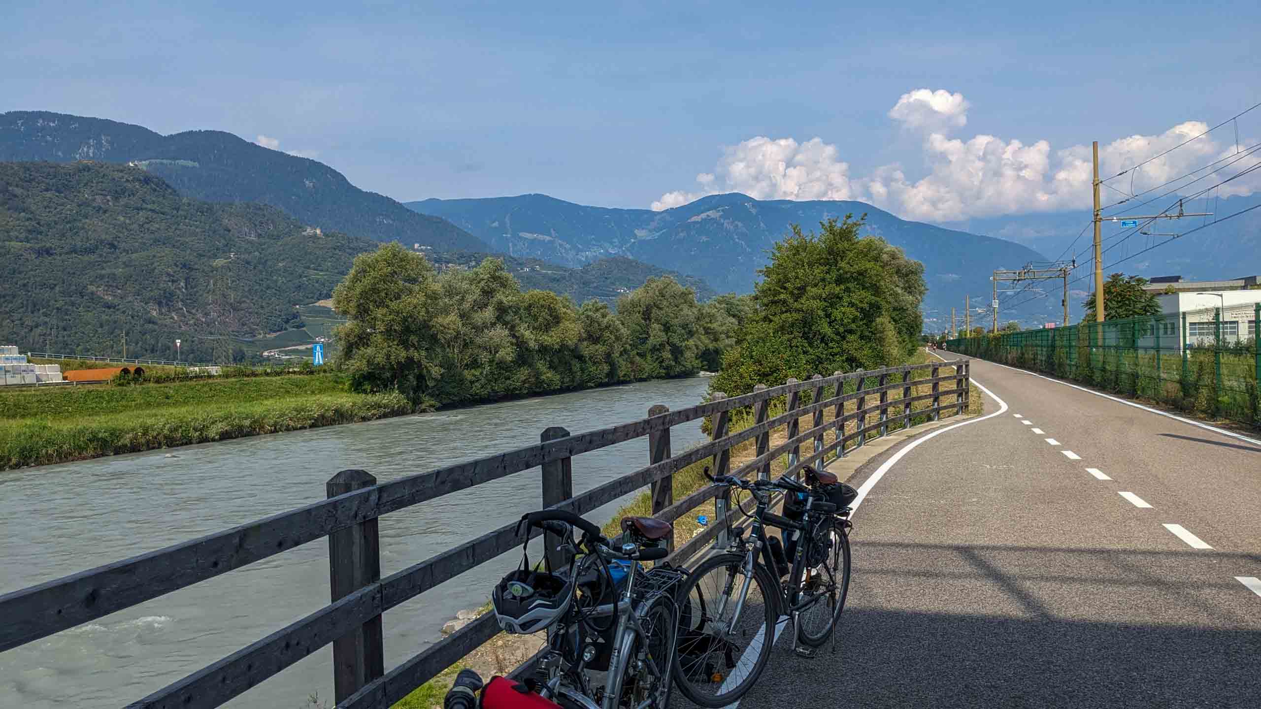 Doch zunächst müssen wir unser Hotel Europa verlassen und den Weg aus Meran heraus finden, was gar nicht so einfach war und wir dabei einen entscheidenden Abzweig verpassten. Doch endlich radeln wir erneut durch endlose Plantagen parallel der Etsch und der Bahnstecke. Kurz vor Bozen treffen wir auf den Fluß Eisack, der ein gutes Stück parallel der Etsch verläuft, bevor sich beide Flüsse vereinen.