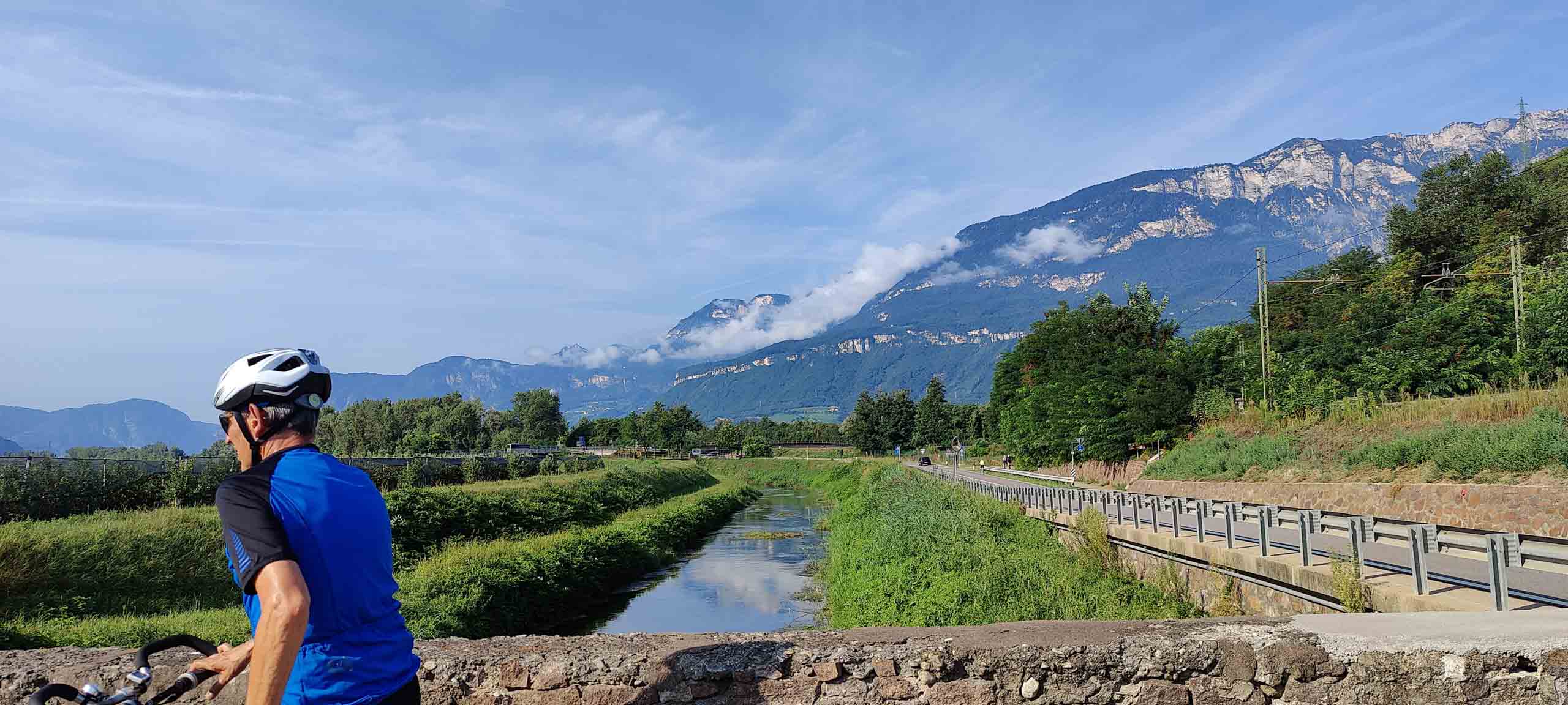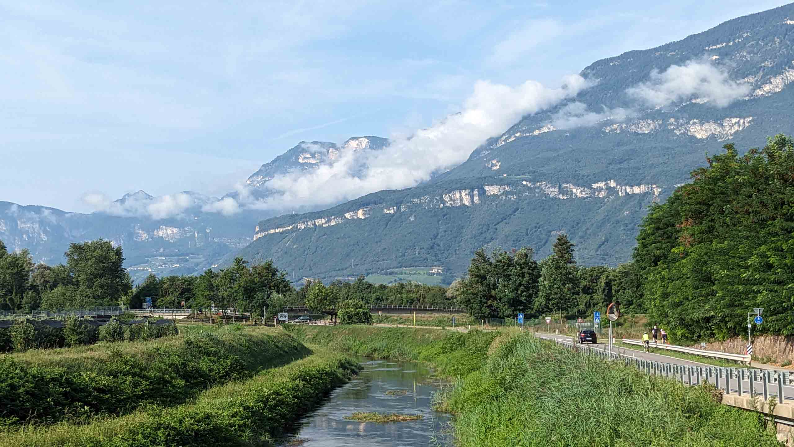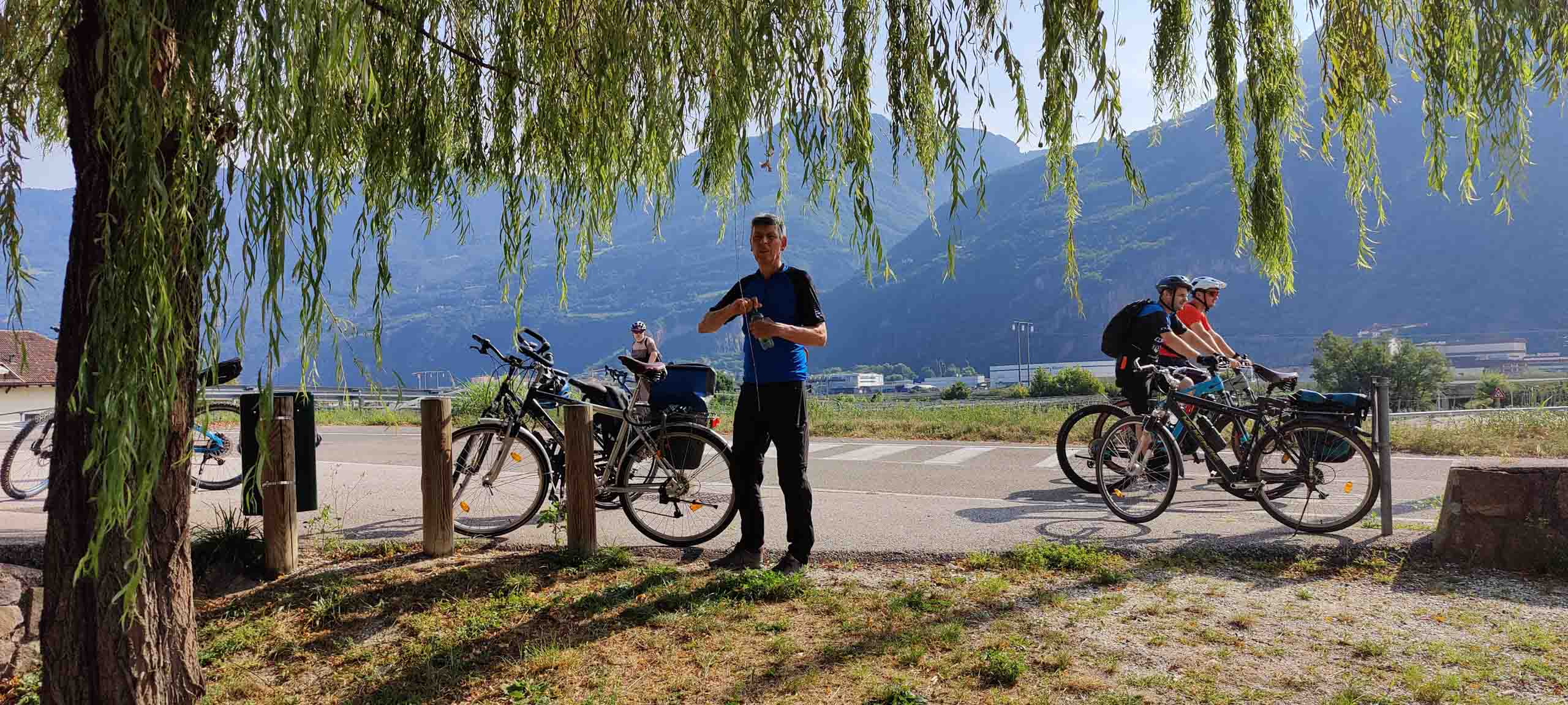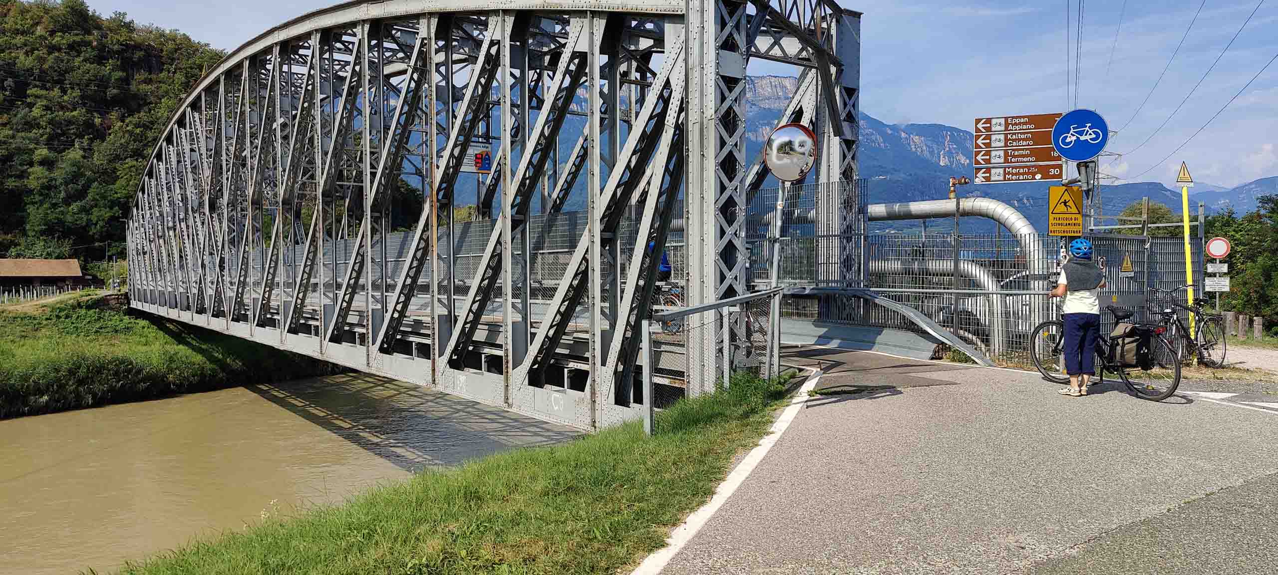 Auf Empfehlung des Hauses radeln wir zunächst Richtung Bozen, biegen aber am Schloß Sigmundskron, dem Messner Mountain Museum nach Norden ab und versuchen den richtigen Weg nach Girlan zu finden. Leider klappt dies nicht so recht und wir kommen von der Route ab, radeln hoffnungsvoll weiter bis St. Michael. Dort dehen wir ein Hinweisschild zum Montiggler See. Der scheinbare Radweg geht bald in einen schlechten Wanderweg über. Wir wollen nicht zurück und kämpfen uns weiter durch den Wald. Schließlich versagt auch noch die Navigation. Wir haben Mühe, wieder auf den rechten Weg zu gelangen. Irgendwie erreichen wir dann doch noch unser Tagesziel, den Montiggler See. Wir haben noch ausreichend Zeit für ein erfrischendes Bad im See. Der EIntritt für Rentner ist in Italien übrigens deutlich ermäßigt!