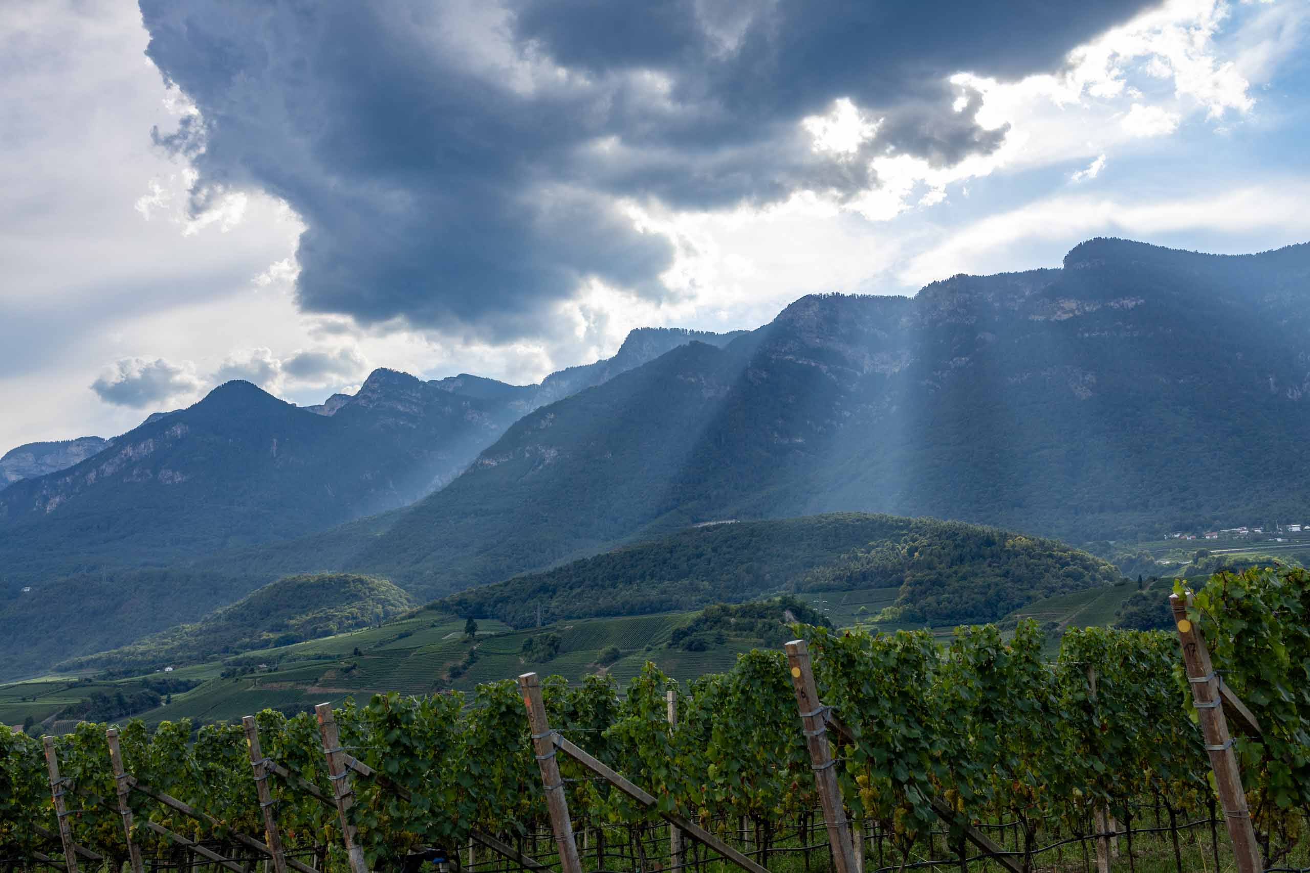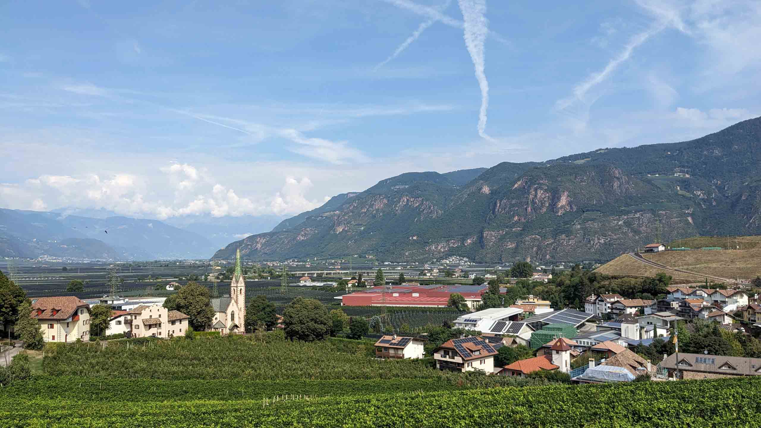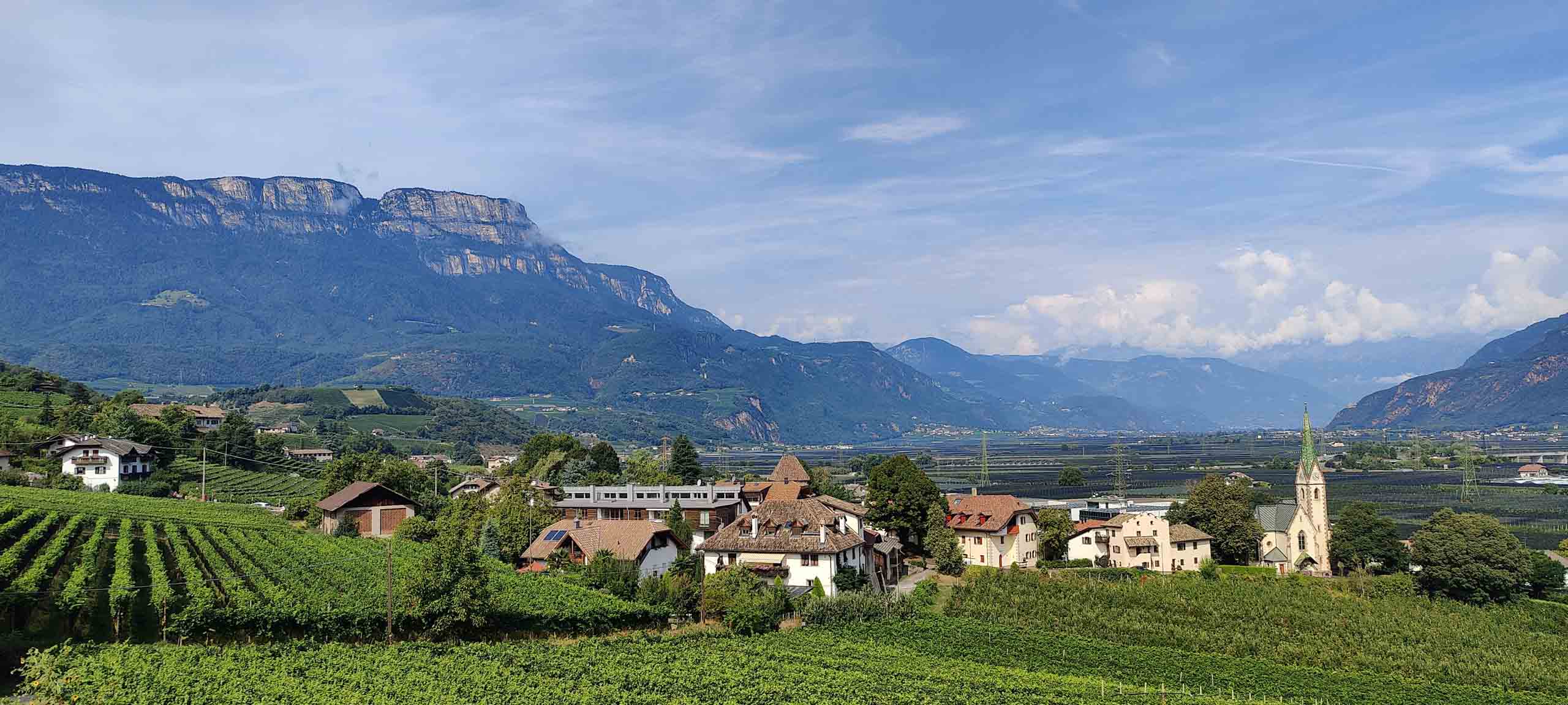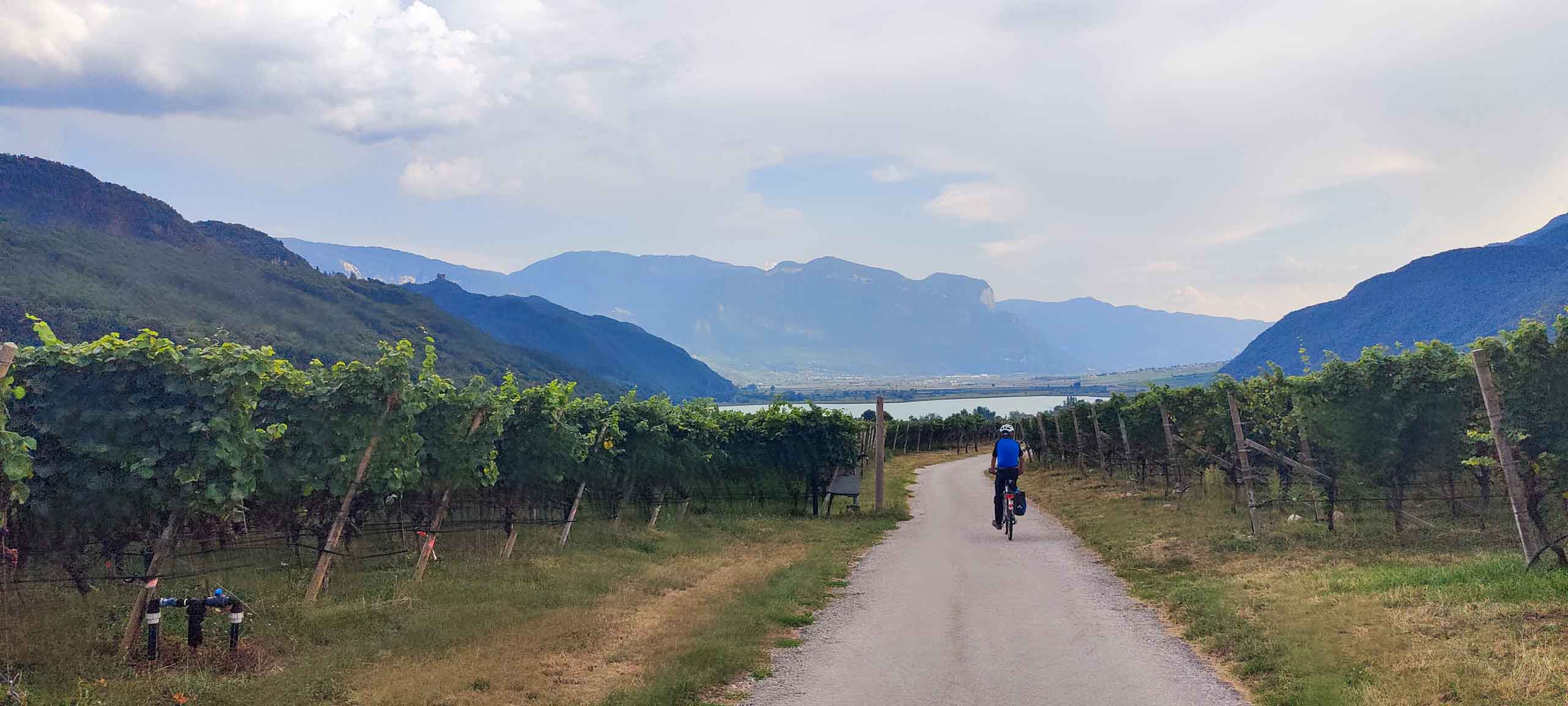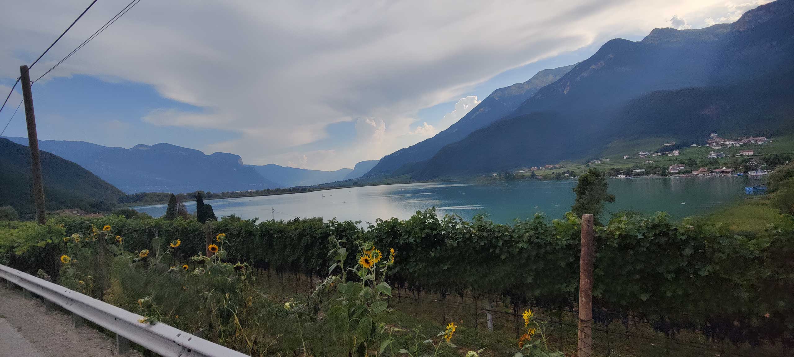 Am späten Nachmittag fahren wir wiederum durch Weinberge zum Kalterer See, den wir bald unten im Tal liegen sehen. Es ist nicht das erste Mal, dass wir diesen schönen Blick erleben.