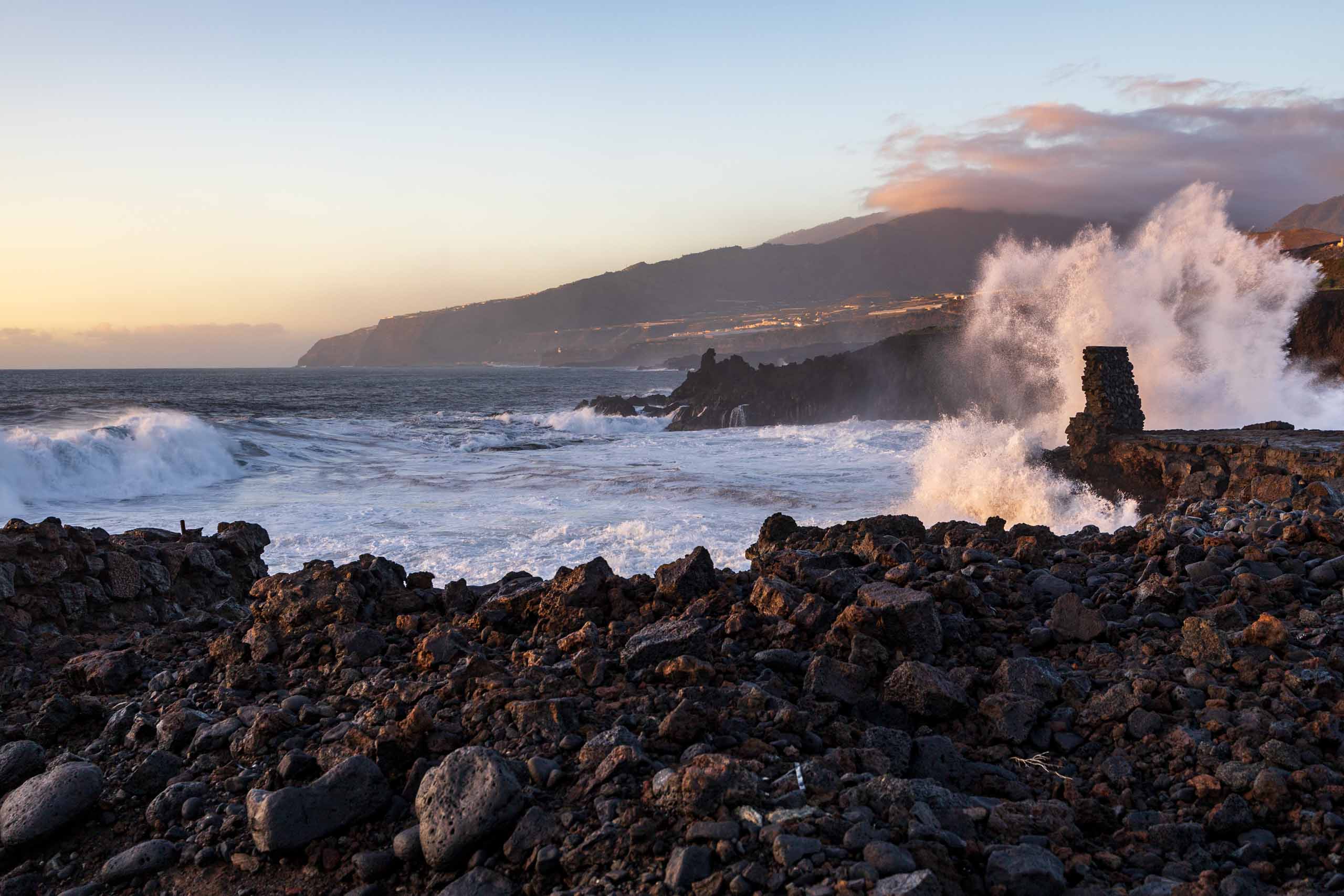 Nicht weit entfernt, gelangt man zum Leuchtturm von Las Hoyas. Der achteckige, weiße Betonturm ist 48 Meter hoch. Er steht auf einer großen Lavaplattform direkt am Atlantischen Ozean.