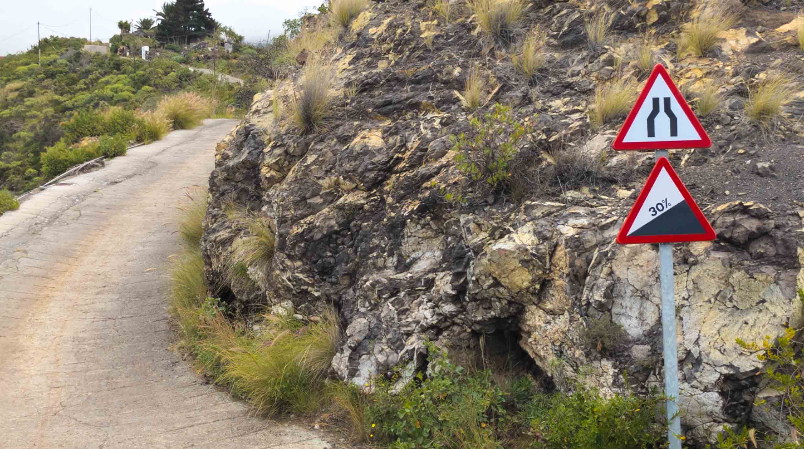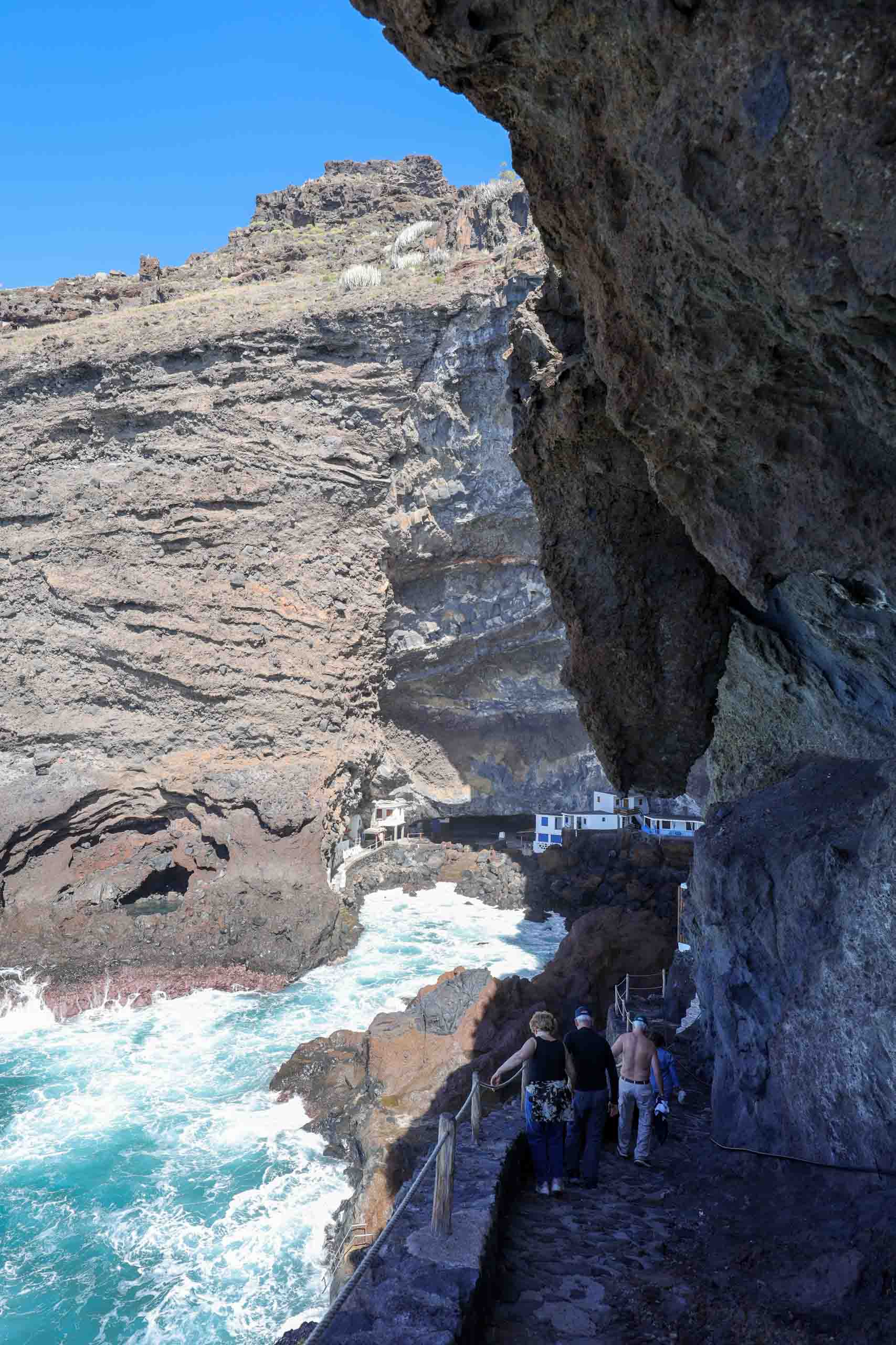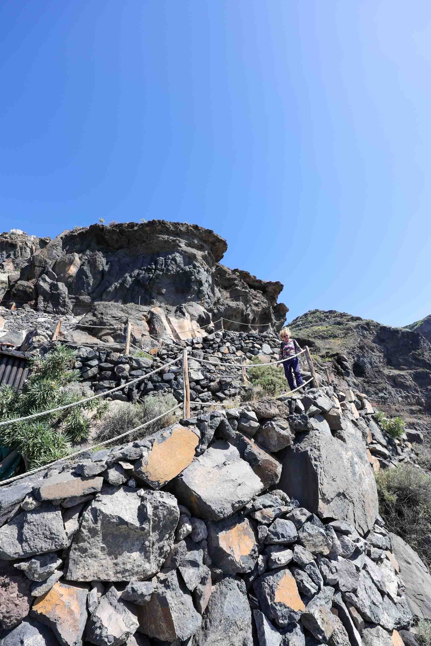 In der Nähe der Cueva Bonita bei Tijarafe findet man die sogenannte Piratenbucht (Porís de Candelaria). Es ist nicht ganz einfach, dorthin zu gelangen. Die hinunter führende Straße ist vormittags gesperrt und so haben wir es zunächst als Wanderung versucht, dann aber wegen des langen und steilen Rückwegs abgebrochen um es später per Mietwagen zu versuchen, was wegen der vielen Engstellen und PKW auch nicht so einfach war.