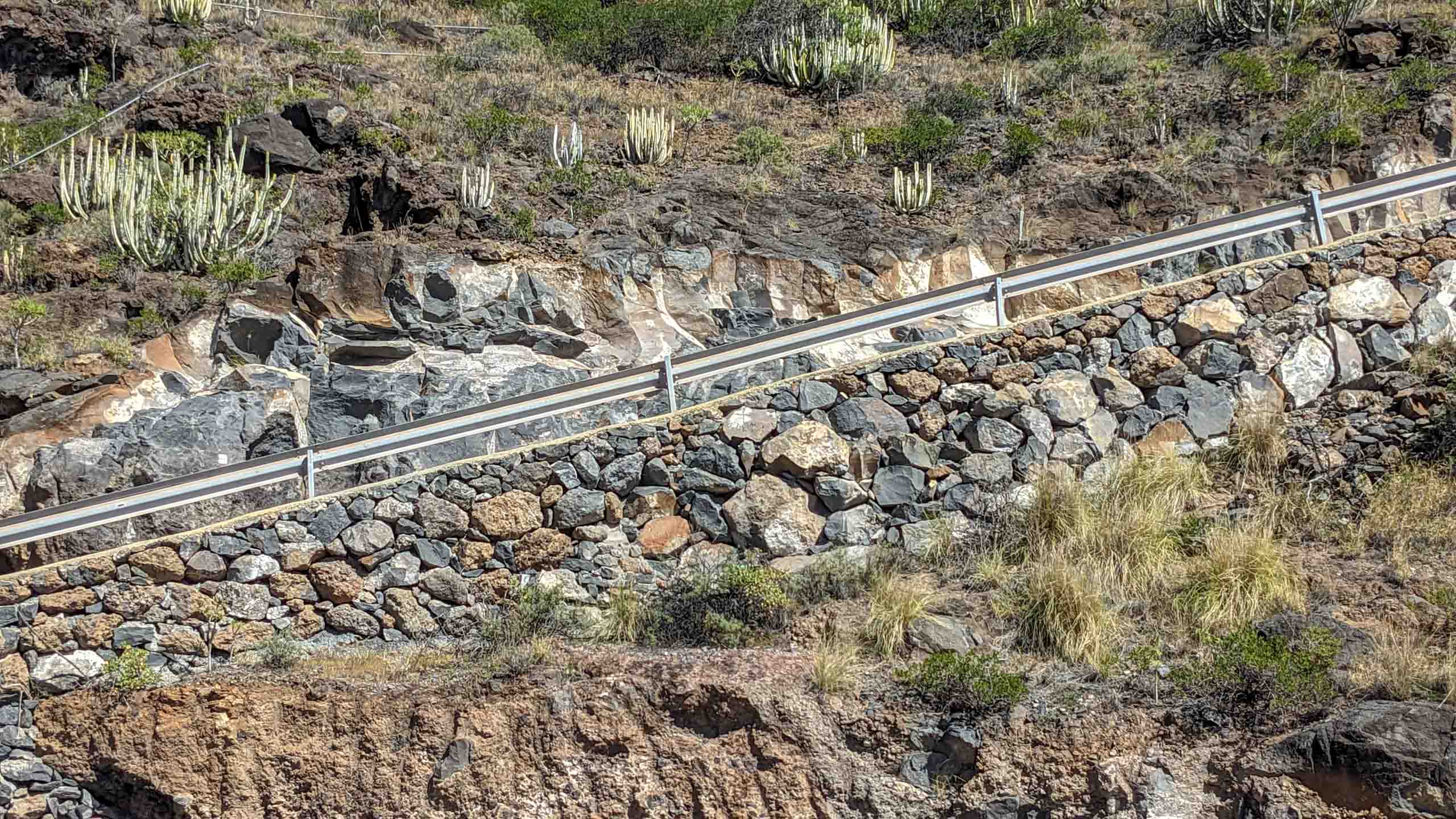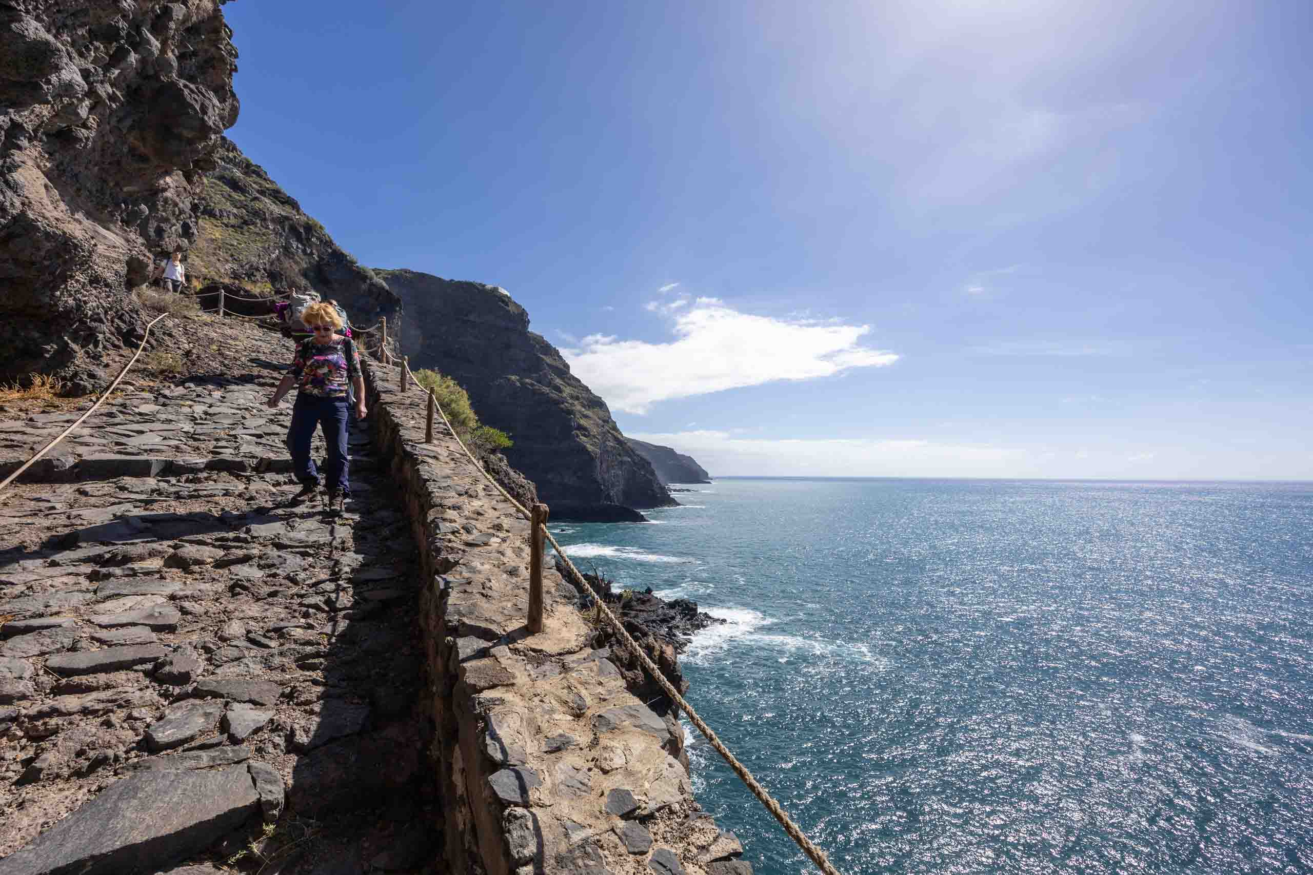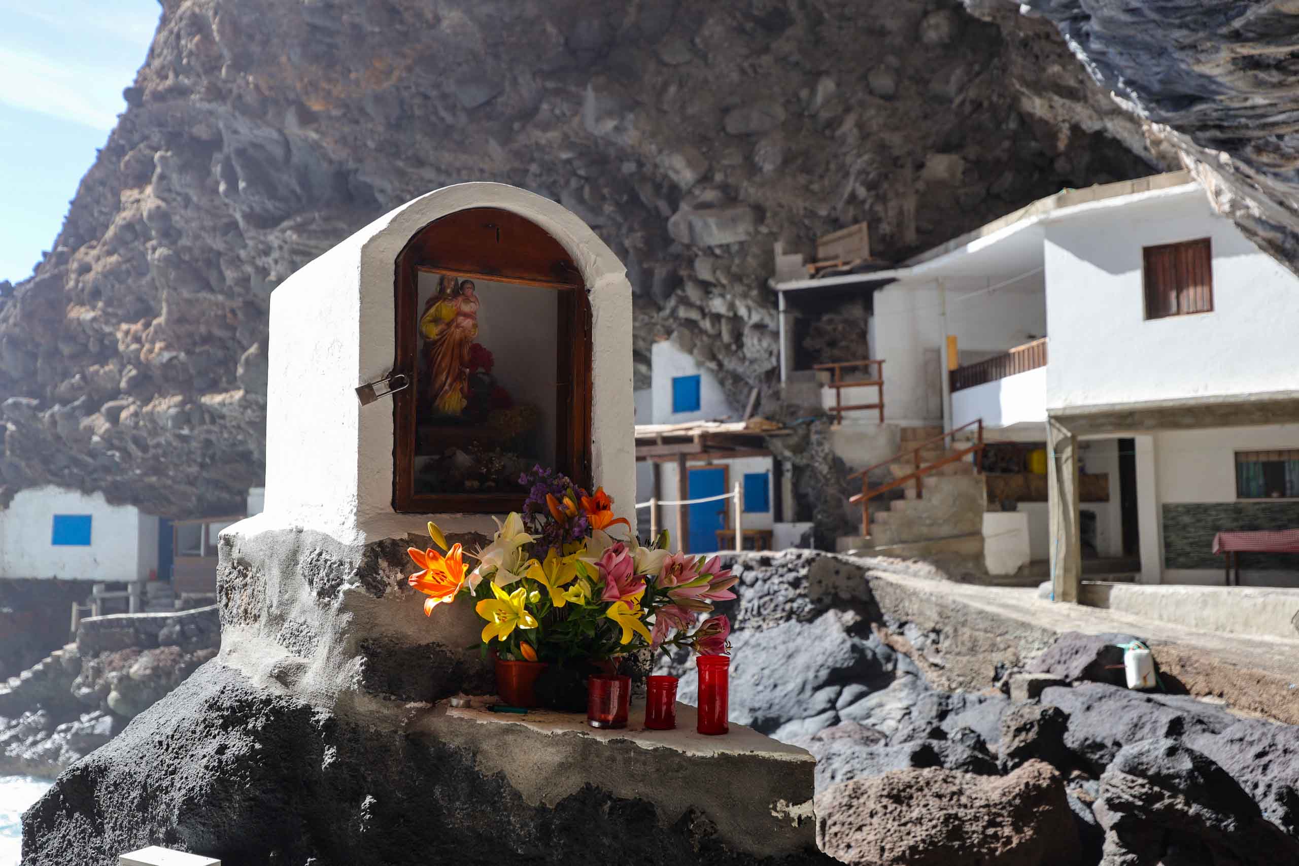In der Nähe der Cueva Bonita bei Tijarafe findet man die sogenannte Piratenbucht (Porís de Candelaria). Es ist nicht ganz einfach, dorthin zu gelangen. Die hinunter führende Straße ist vormittags gesperrt und so haben wir es zunächst als Wanderung versucht, dann aber wegen des langen und steilen Rückwegs abgebrochen um es später per Mietwagen zu versuchen, was wegen der vielen Engstellen und PKW auch nicht so einfach war.