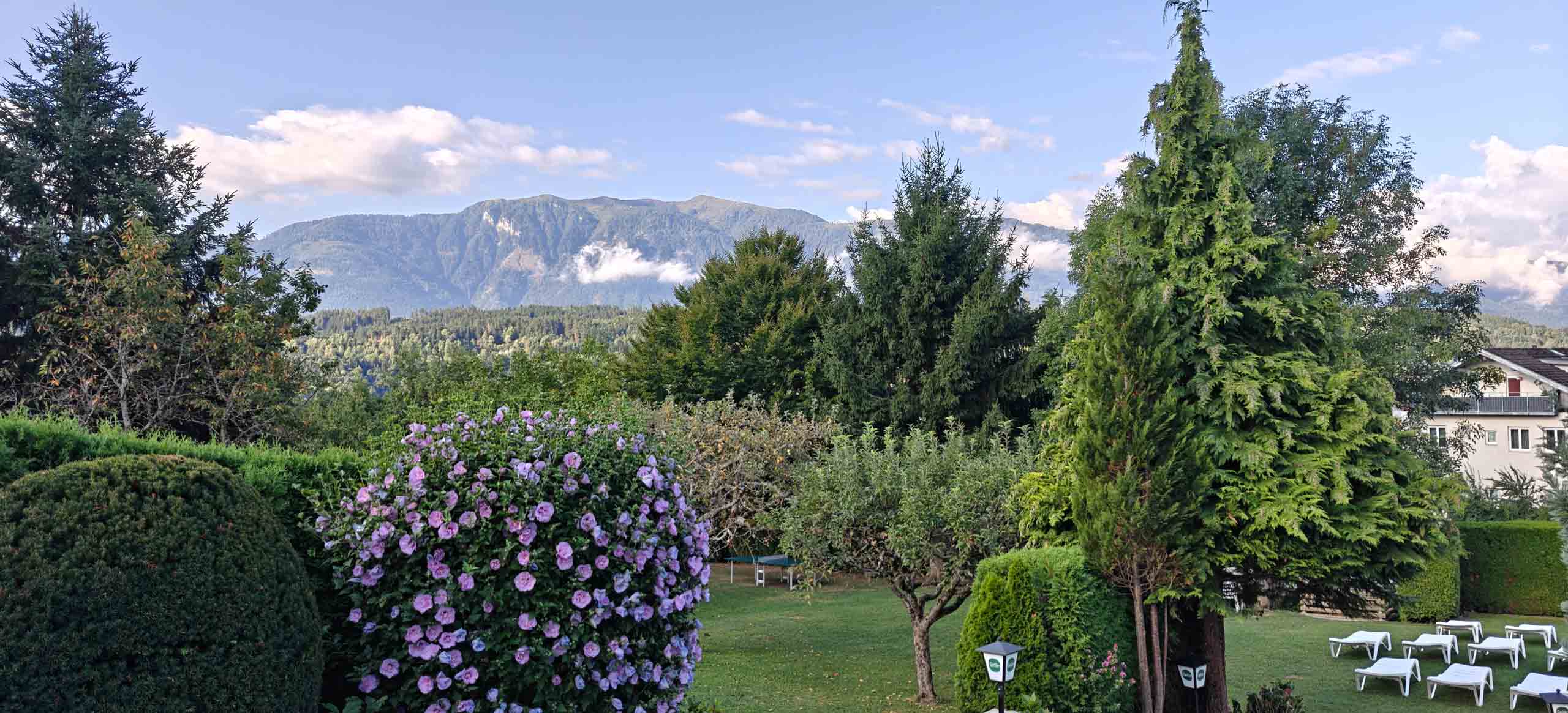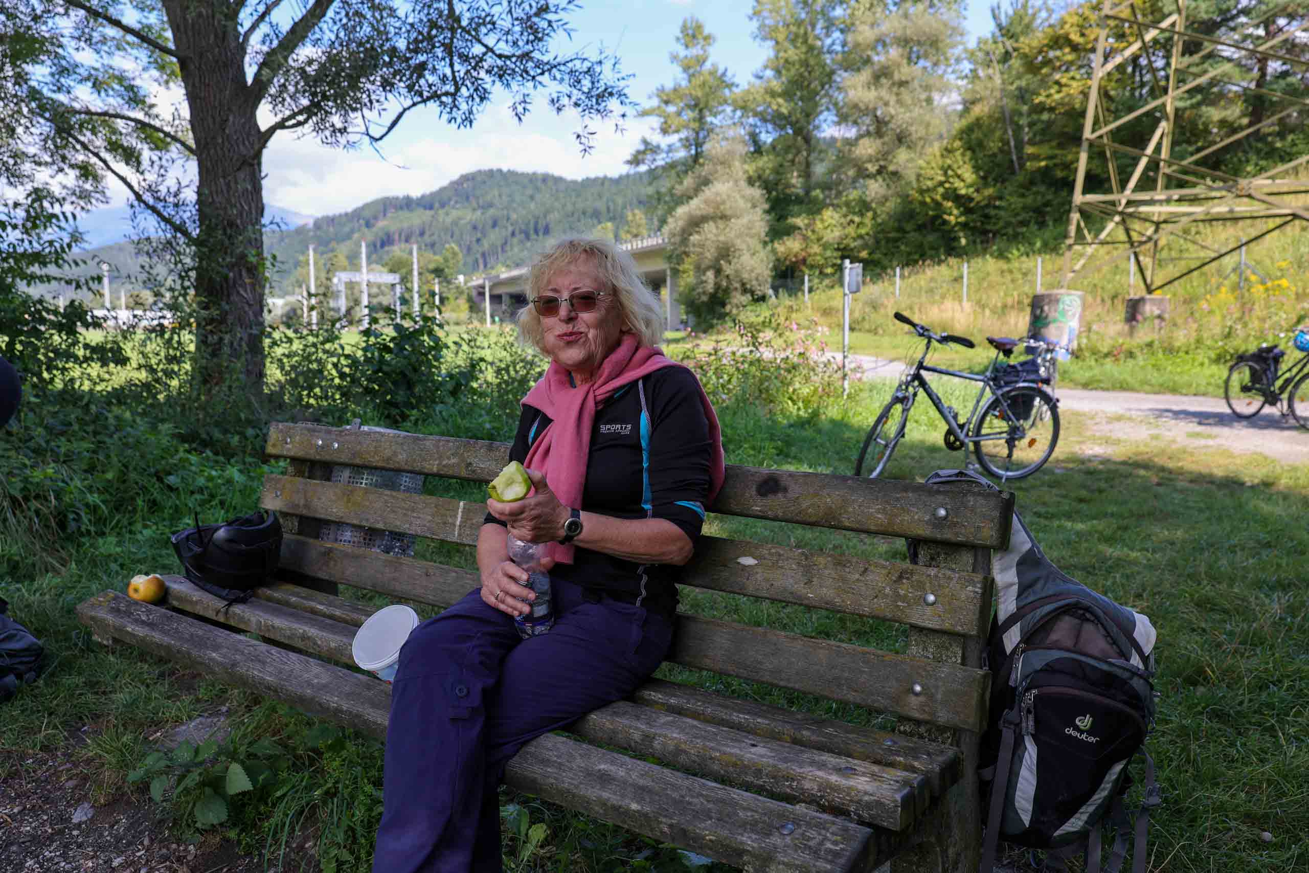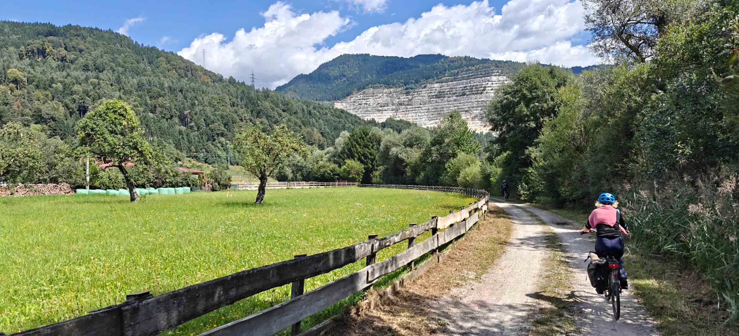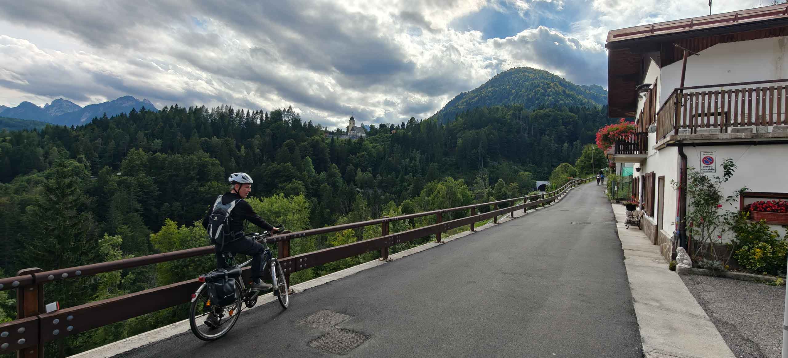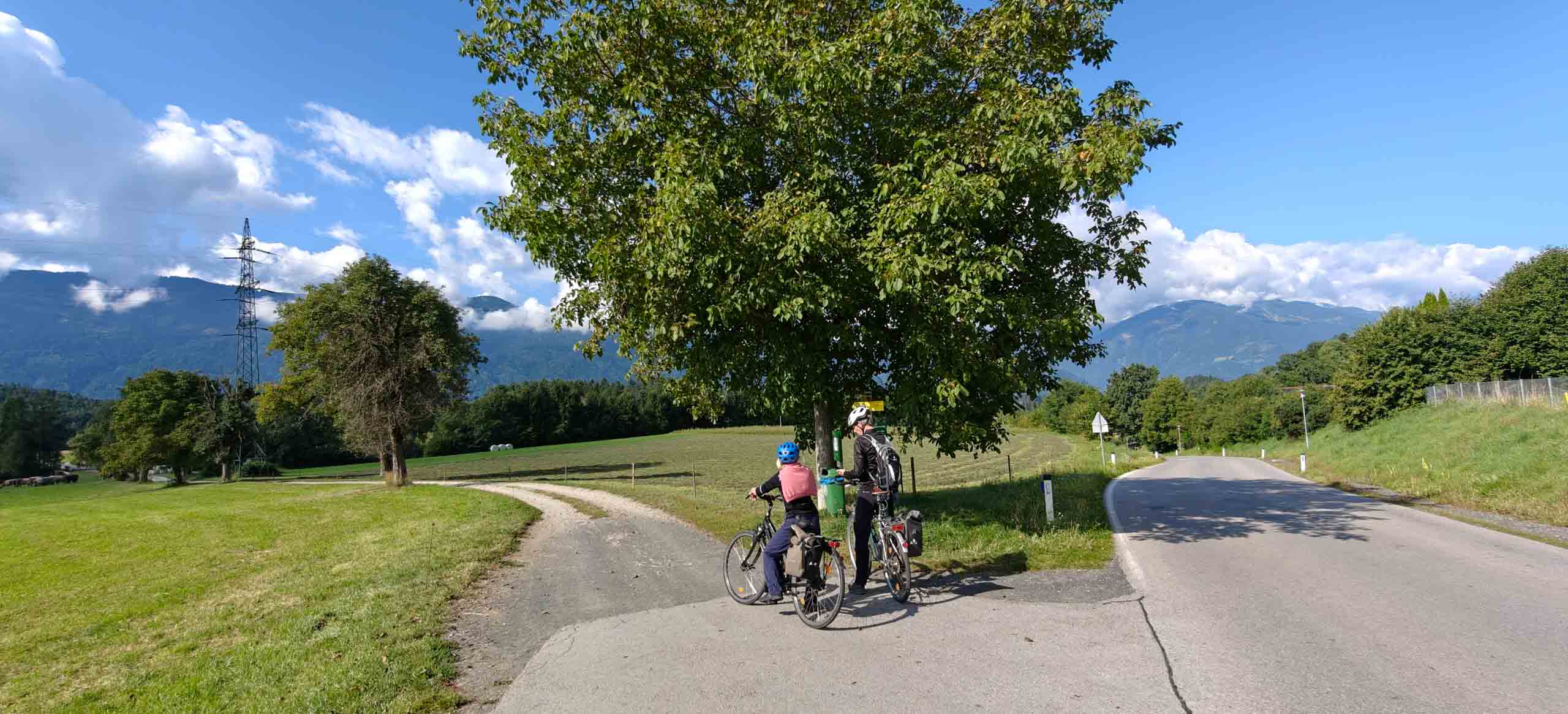 Die heutige Etappe sollte uns besonders fordern. Nach dem leckeren Frühstücksbuffet mussten zunächst den Hauptradweg finden. Auf dem Weg dorthin gab es jedoch eine Umleitung, auf der wir dann wegen irgendwann vom Kurs abkamen und uns mitten im Wald auf Waldwegen wiederfanden. Dank GPS gelangten wir dann irgendwie nach Spittal, kamen dort aber erneut vom Weg ab. Endlich wieder an der Drau, ging es endlich zügiger voran. Bis Villach war es aber sehr weit und die Uhrzeit auch. 85 km als Tagesleistung erschienen uns dann doch etwas viel und so nahmen wir in Villach in den Zug. Die Strecke nach Arnoldstein sind wir zudem schon 2021 geradelt. https://x3.halpixel.de/Galerie/Archiv/2021-Villach/. In Arnoldstein ging es weiter mit einem langen Anstieg, auch nach Passieren der italienischen Grenze (mit Espressopause bei einer resoluten Russin) weiter mit dem anstrengenden Auf und Ab. An der Wegscheide nach nach Weißenfels in Slowenien reichten unsere Kräfte bemerkenswerterweise für den dortigen Trimm-Dich-Parkour.
