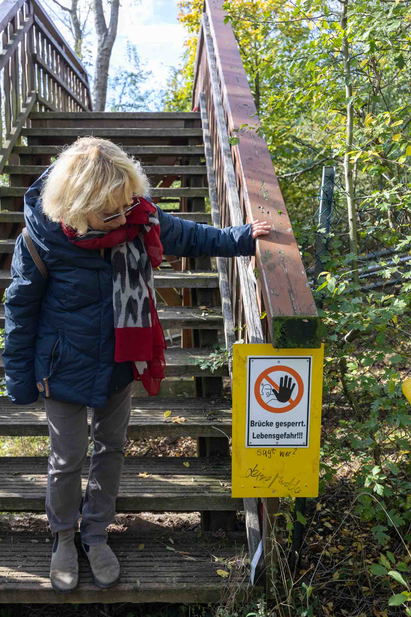 Nun nehmen wir den Pfad durch den Wald in Richtung Sommerrodelbahn. Doch an der Brücke über die Gleise warnt ein Schild "Betreten verboten! Lebensgefahr". Was nun? Entweder sich riskant über die baufällige Brücke zu wagen oder umzukehren und einen langen Umweg zu gehen. Weiter unten stehen dagegen offizielle Wegweiser zu genau diesem Pfad. Unten gibt es inzwischen keinerlei Gastronomie mehr, alles ist verwaist und verfällt zusehends. Lediglich Tierpark und Sommerrodelbahn sind noch in Betrieb. Immerhin.