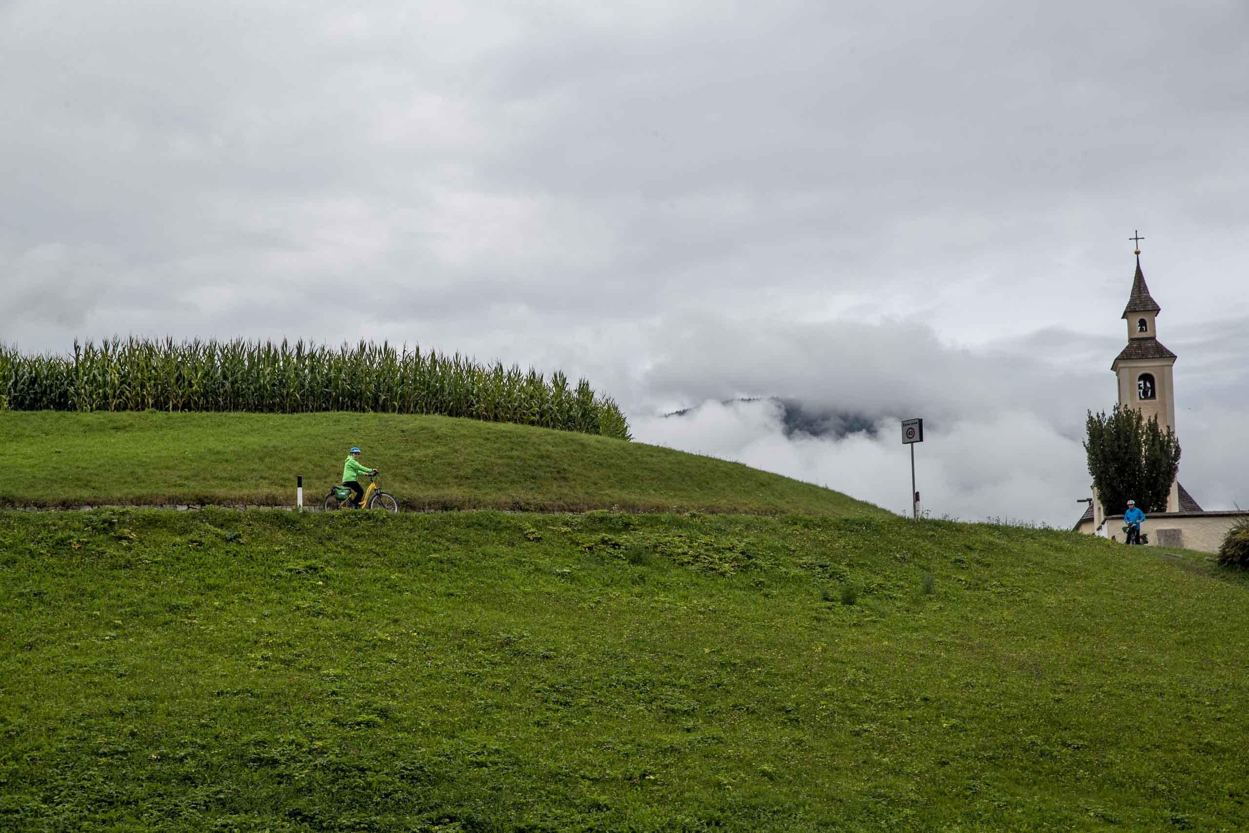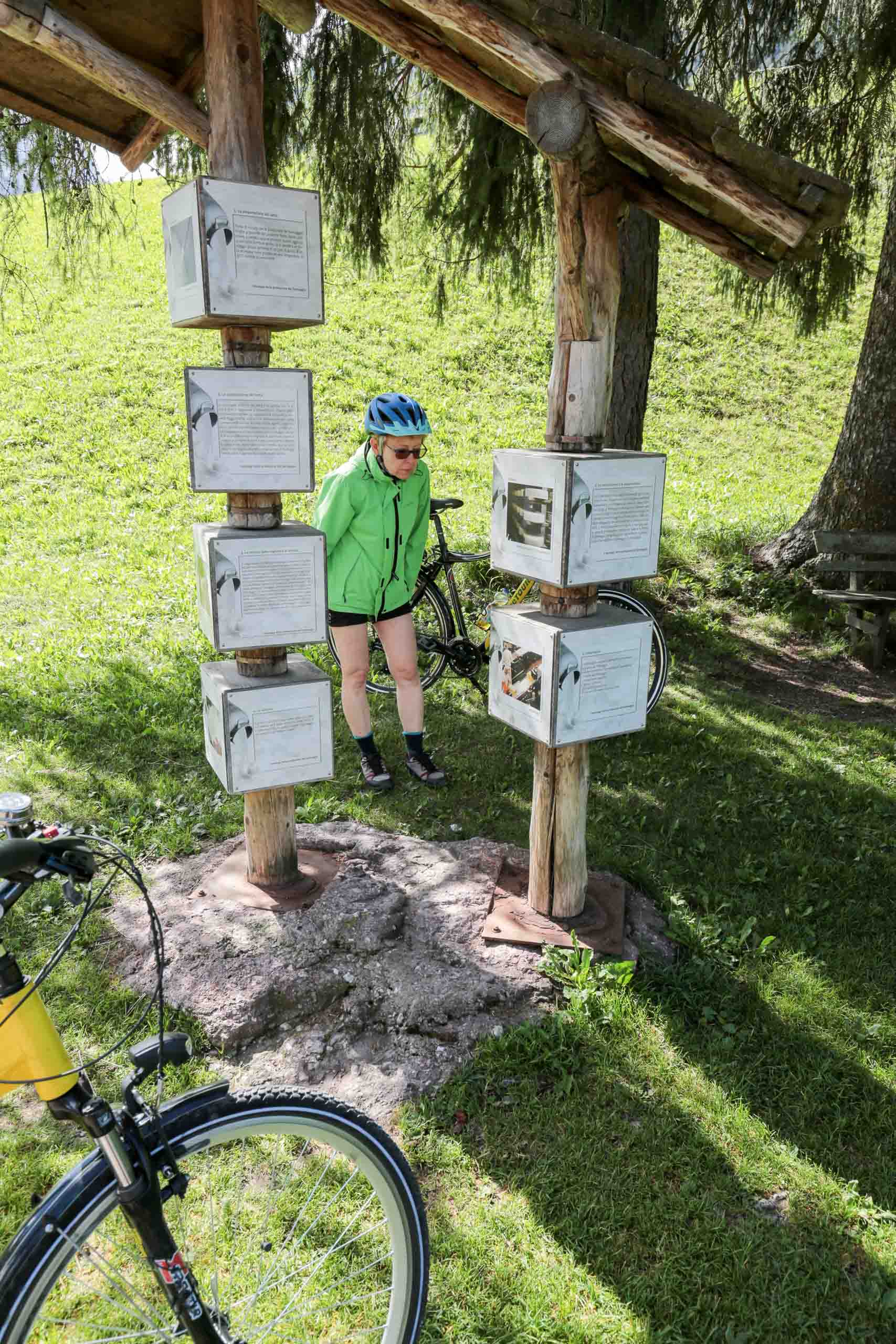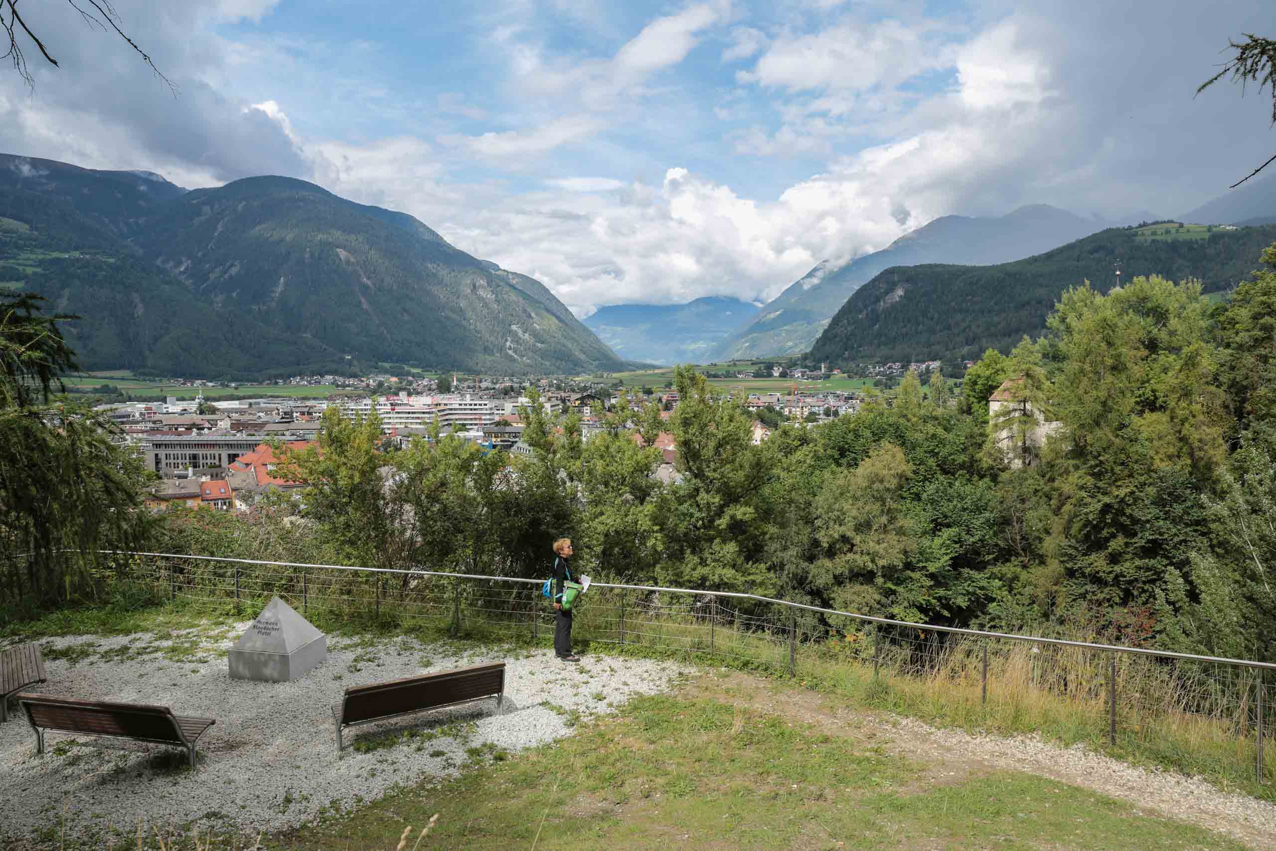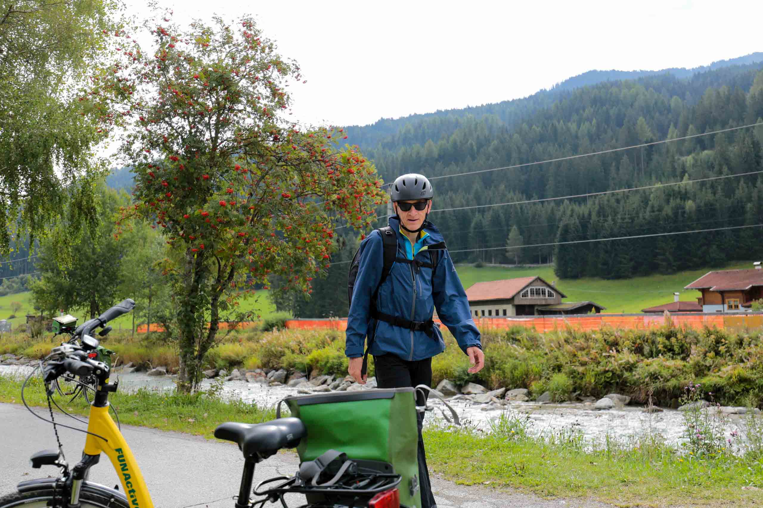 Unterwegs entdeckten wir unter einer Brücke einen goldfarbenen Turm. Ursprünglich der Pfeiler einer bedeutenden Eisenbahnbrücke , später als Teil eines Kunstprojekts ist er inzwischen fast zugewachsen. Bruneck ist der Hauptort des Pustertales und mit 16000 Einwohnern ein ziemlich quirliger Ort. Am Fuße des Schlossbergs befindet sich die Altstadt, die von der Rienz in einer Schleife im Norden umflossen wird. Vom Waldfriedhof aus hat man einen schönen Blick auf die umliegenden Täler sowie das Schloss Bruneck, welches heute von Reinhold Messner als „Mountain Museum Bergvölker“ genutzt wird. (38 km)