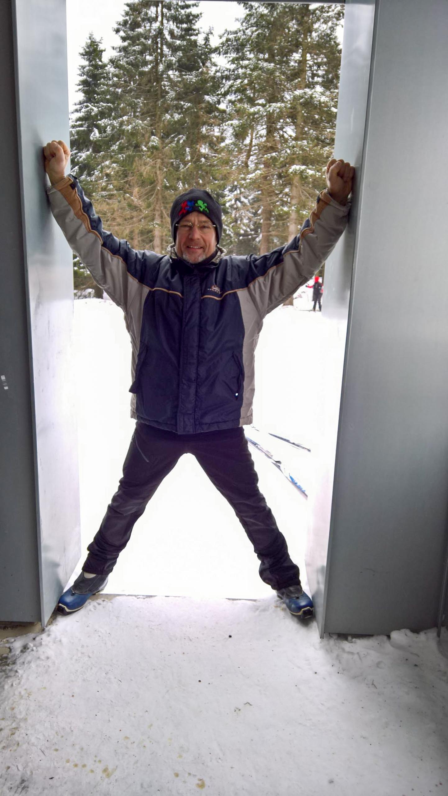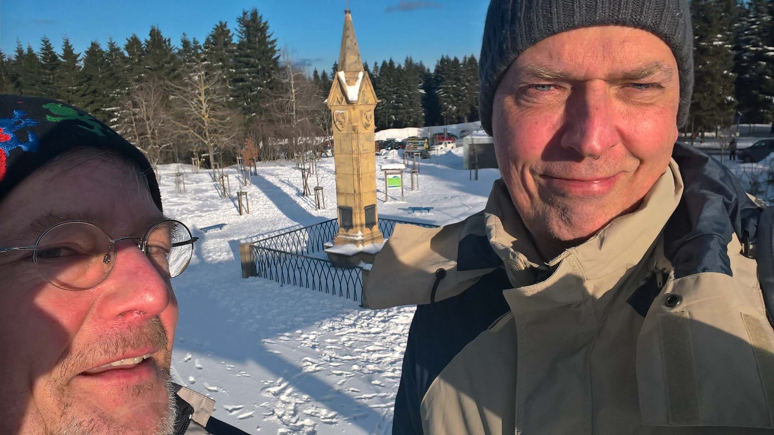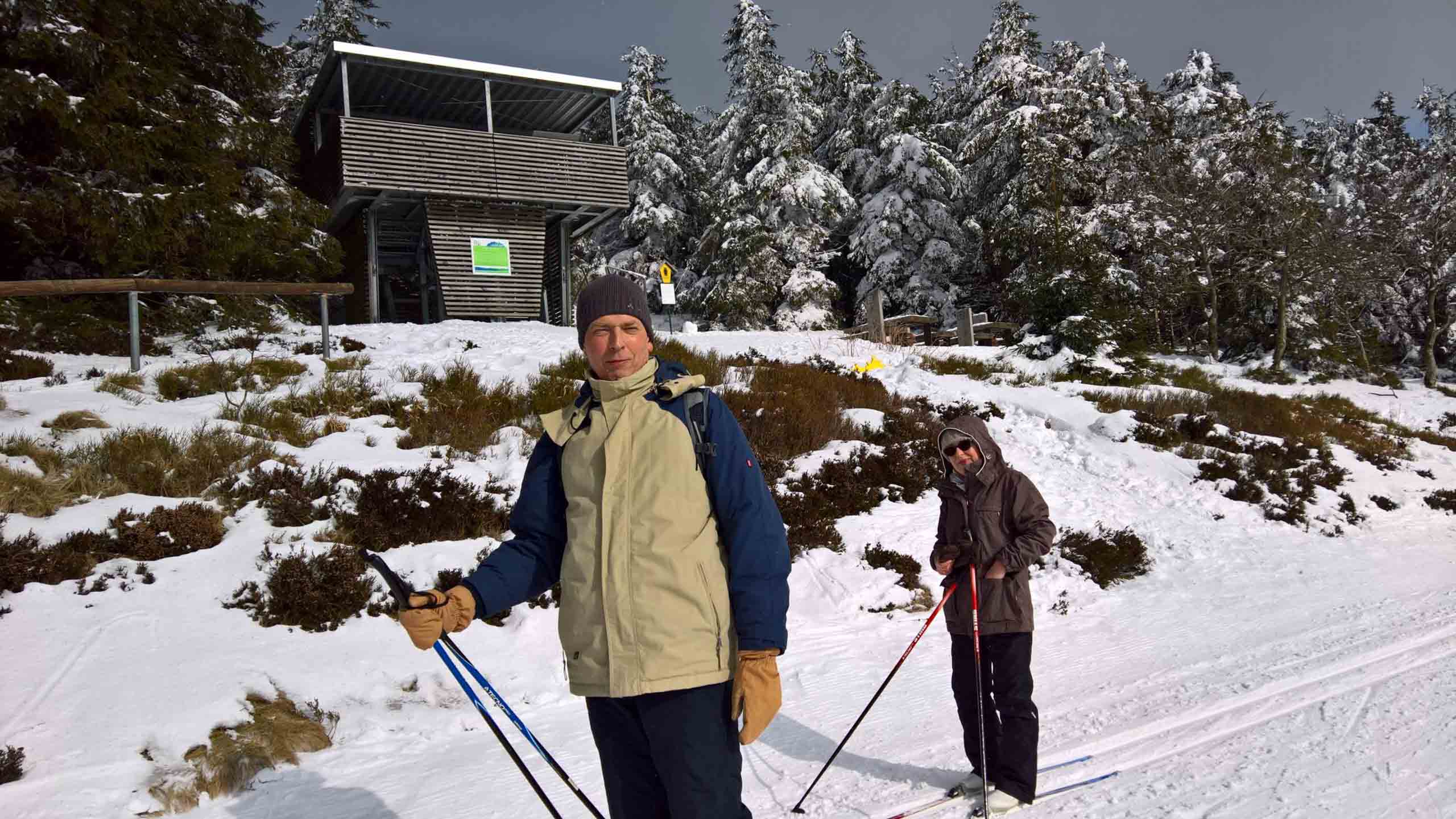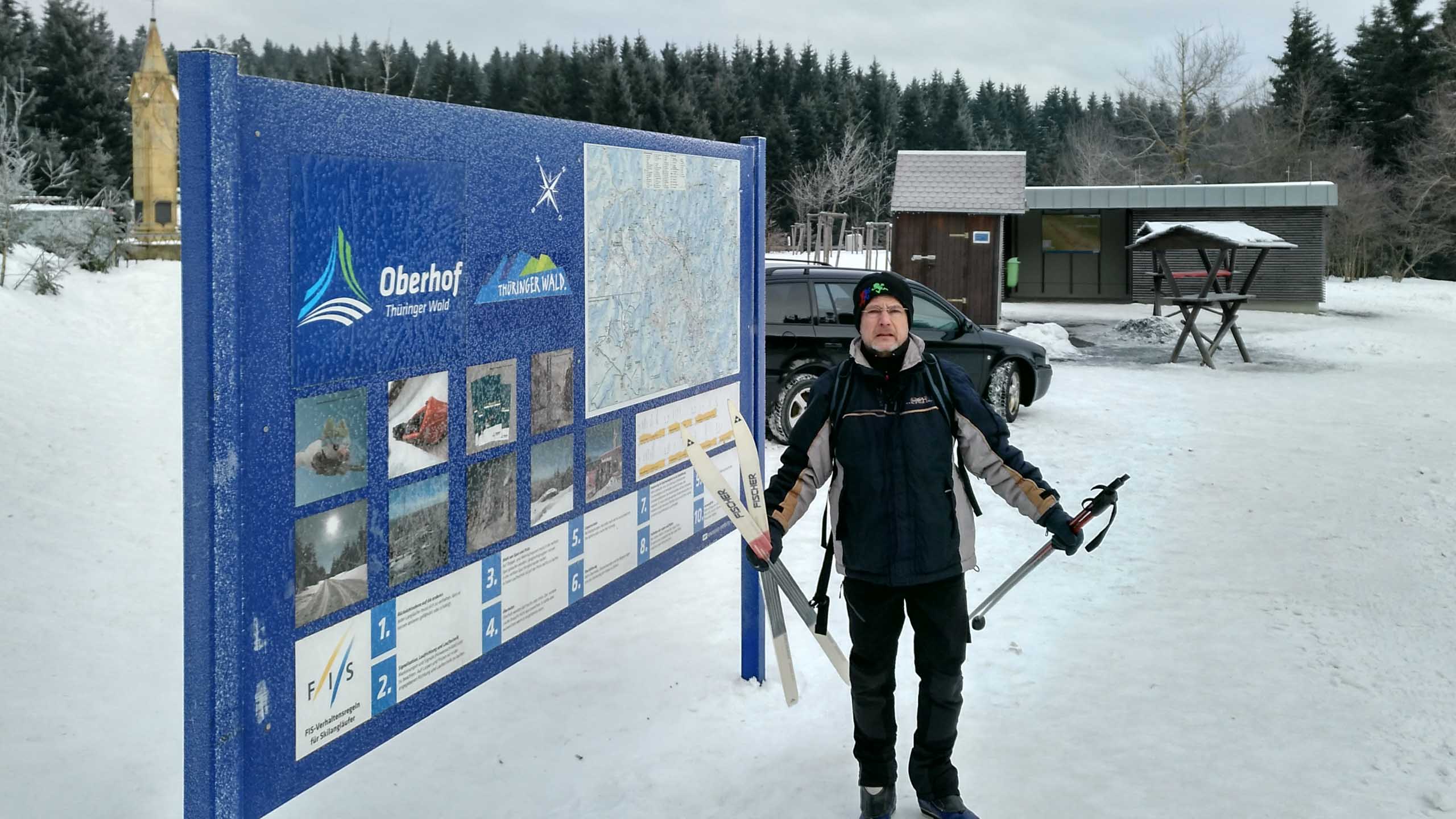 Hans und seine Schwester warteten bereits am vereinbarten Treffpunkt. Im Freien herrschten -8°C bei schneidendem Nordwind, der uns anfangs etwas Sorgen bereitete. So wählten wir eine Route durch den geschützten Wald und nicht entlang der Kammlage. Trotzdem brauchten wir eine ganze Weile, um endlich auf Betriebstemperatur zu kommen. Mit einigen kleinen Pausen liefen wir bis zu Plänckners Aussicht am Großen Beerberg. Mit 982,9 m ist dieser Berg die höchste Erhebung Thüringens. Leider war die Aussicht nicht wie erwartet und so zogen wir bald weiter bis zur Suhler Hütte. Dort fanden wir noch ein Plätzchen für unsere ausgiebige Mittagspause mit Linsensuppe. Anschließend ging es auf ähnlichem Weg zurück zum Oberhofer Rondell. Bei Kaffee und Eis haben wir 4 uns noch sehr gut unterhalten, bevor wir uns wieder auf die Heimreise machten. Auf der Autobahn trennten sich dann wieder unsere Wege. Bleibt abschließend der Wunsch, dass es nicht wieder 13 Jahre braucht, bis wir diese Langlaufstrecke erneut absolvieren!