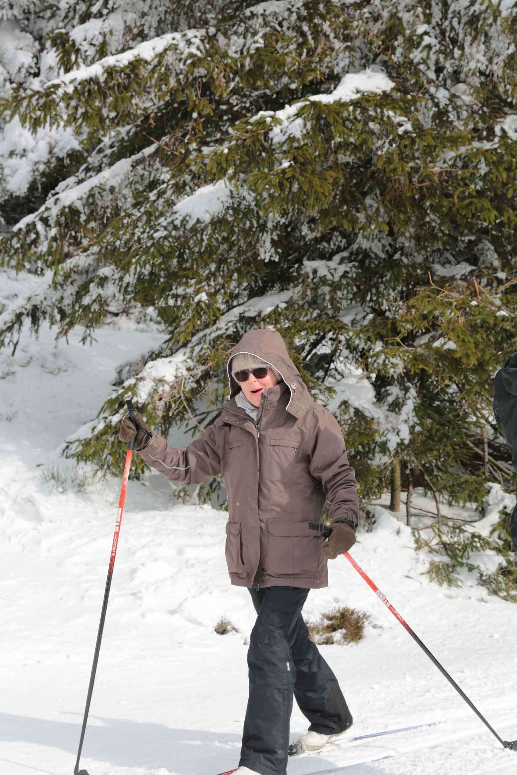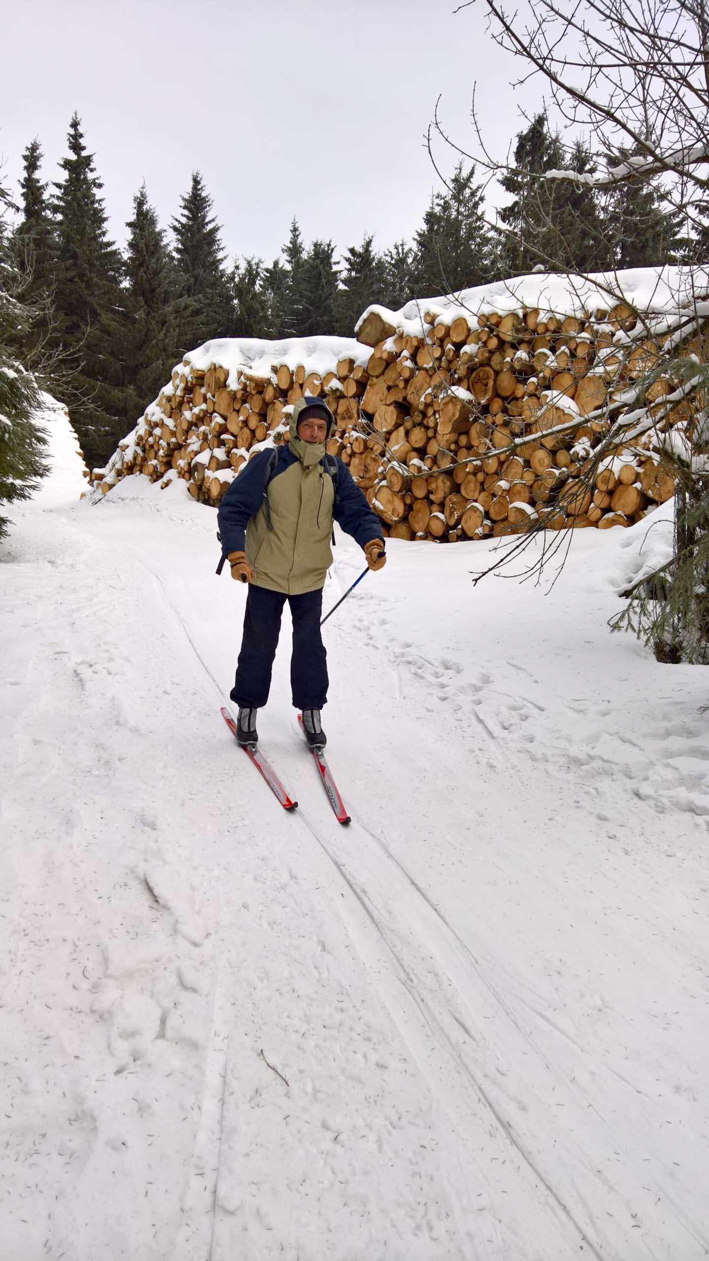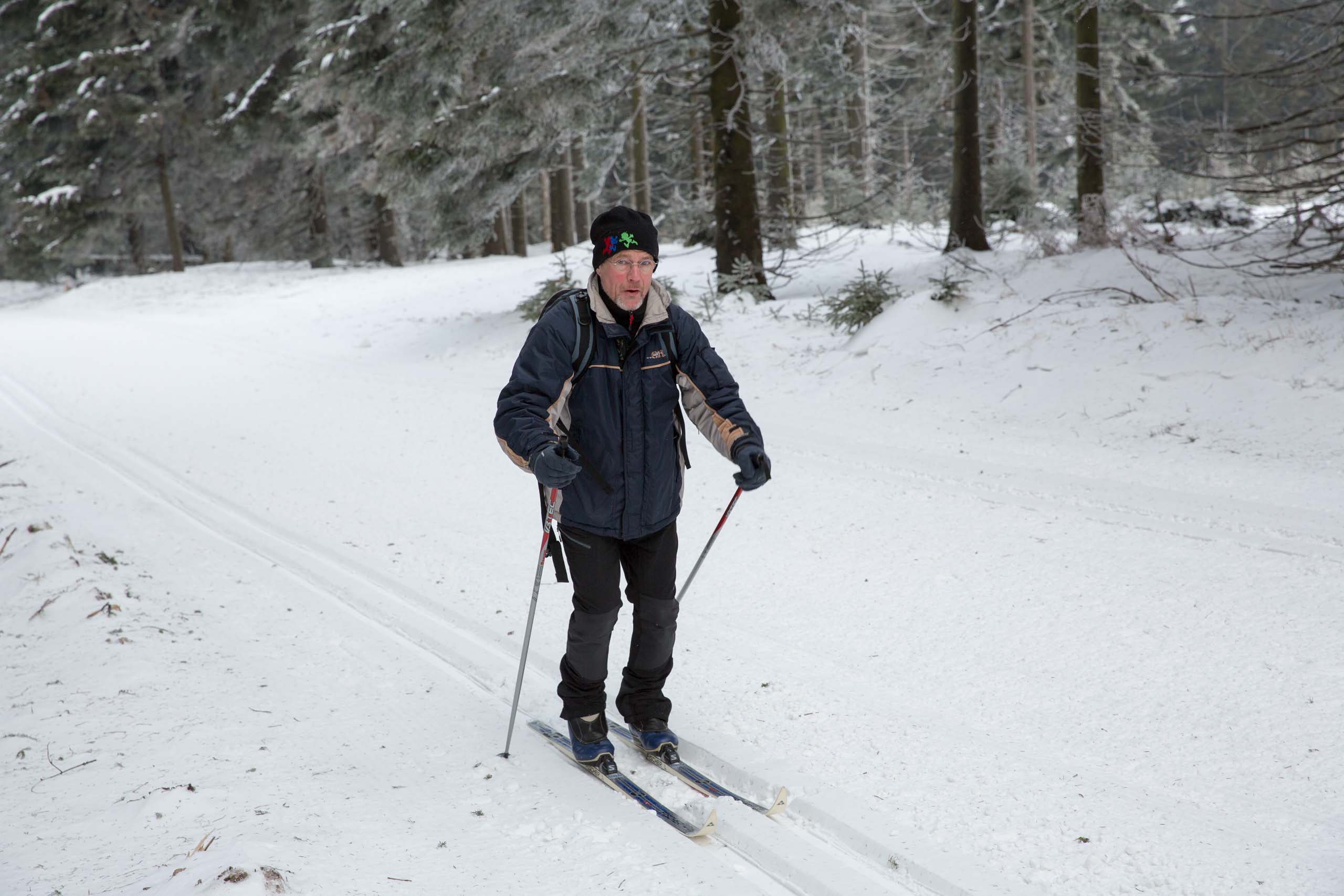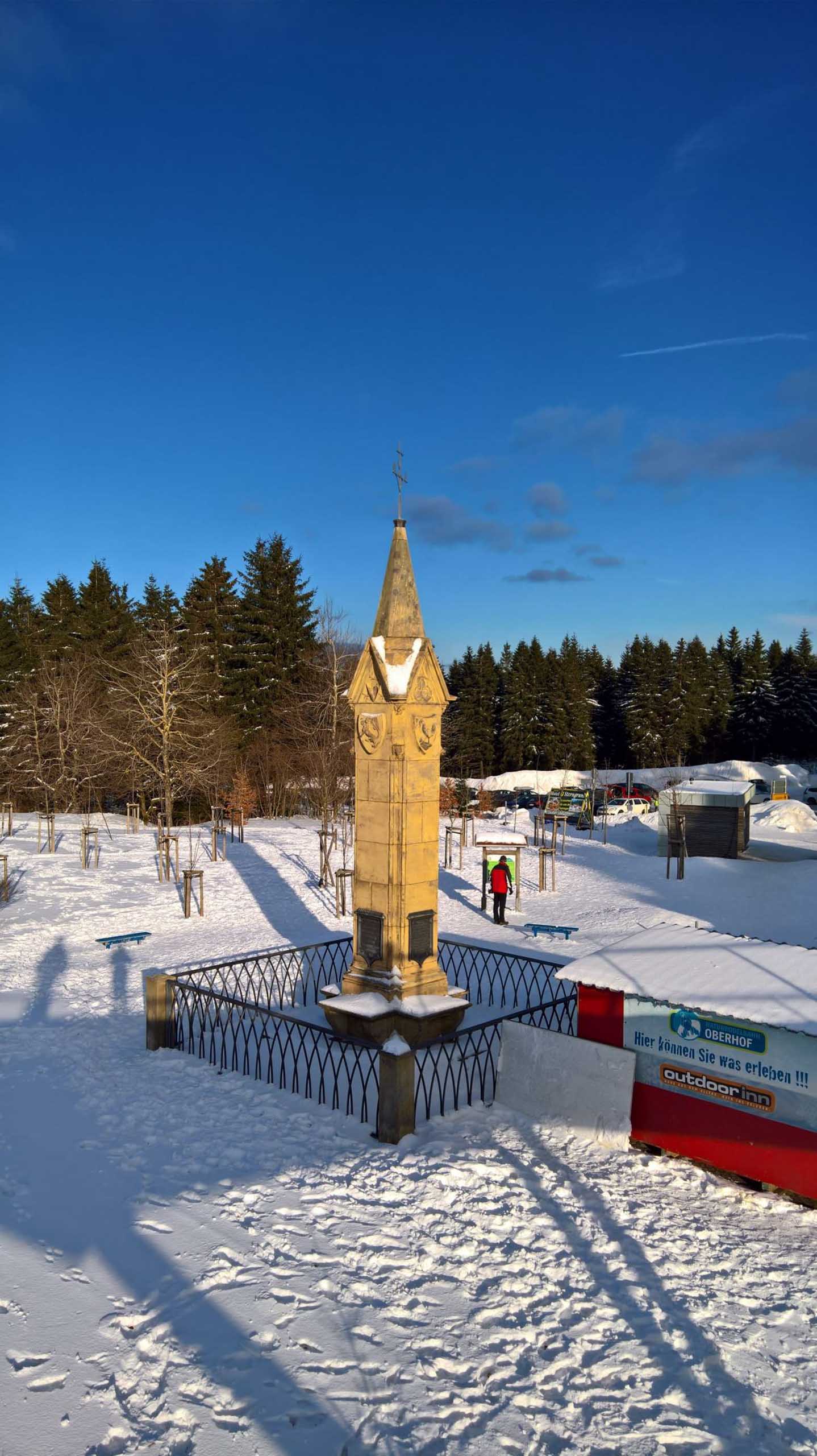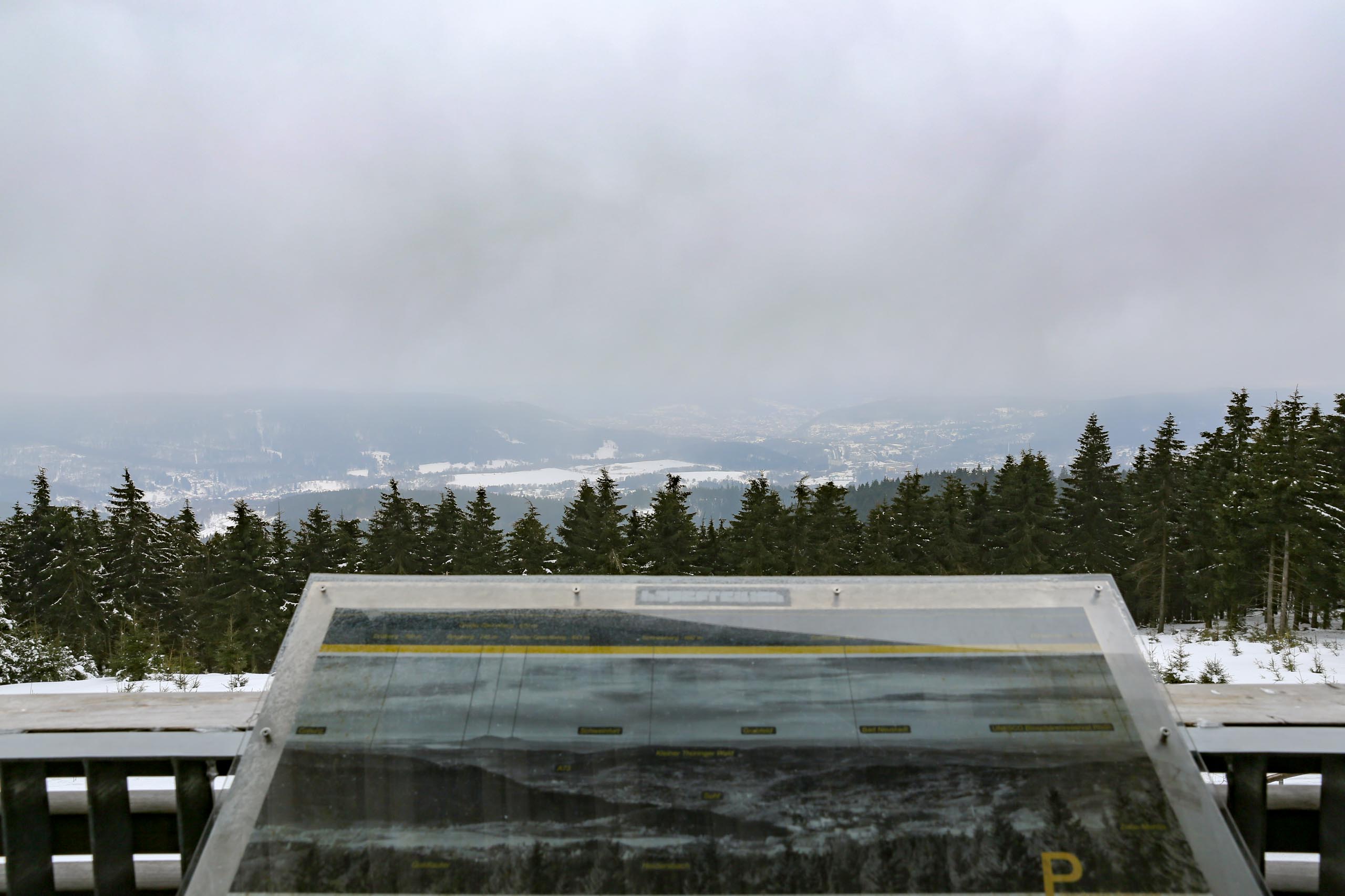 Hans und seine Schwester warteten bereits am vereinbarten Treffpunkt. Im Freien herrschten -8°C bei schneidendem Nordwind, der uns anfangs etwas Sorgen bereitete. So wählten wir eine Route durch den geschützten Wald und nicht entlang der Kammlage. Trotzdem brauchten wir eine ganze Weile, um endlich auf Betriebstemperatur zu kommen. Mit einigen kleinen Pausen liefen wir bis zu Plänckners Aussicht am Großen Beerberg. Mit 982,9 m ist dieser Berg die höchste Erhebung Thüringens. Leider war die Aussicht nicht wie erwartet und so zogen wir bald weiter bis zur Suhler Hütte. Dort fanden wir noch ein Plätzchen für unsere ausgiebige Mittagspause mit Linsensuppe. Anschließend ging es auf ähnlichem Weg zurück zum Oberhofer Rondell. Bei Kaffee und Eis haben wir 4 uns noch sehr gut unterhalten, bevor wir uns wieder auf die Heimreise machten. Auf der Autobahn trennten sich dann wieder unsere Wege. Bleibt abschließend der Wunsch, dass es nicht wieder 13 Jahre braucht, bis wir diese Langlaufstrecke erneut absolvieren!