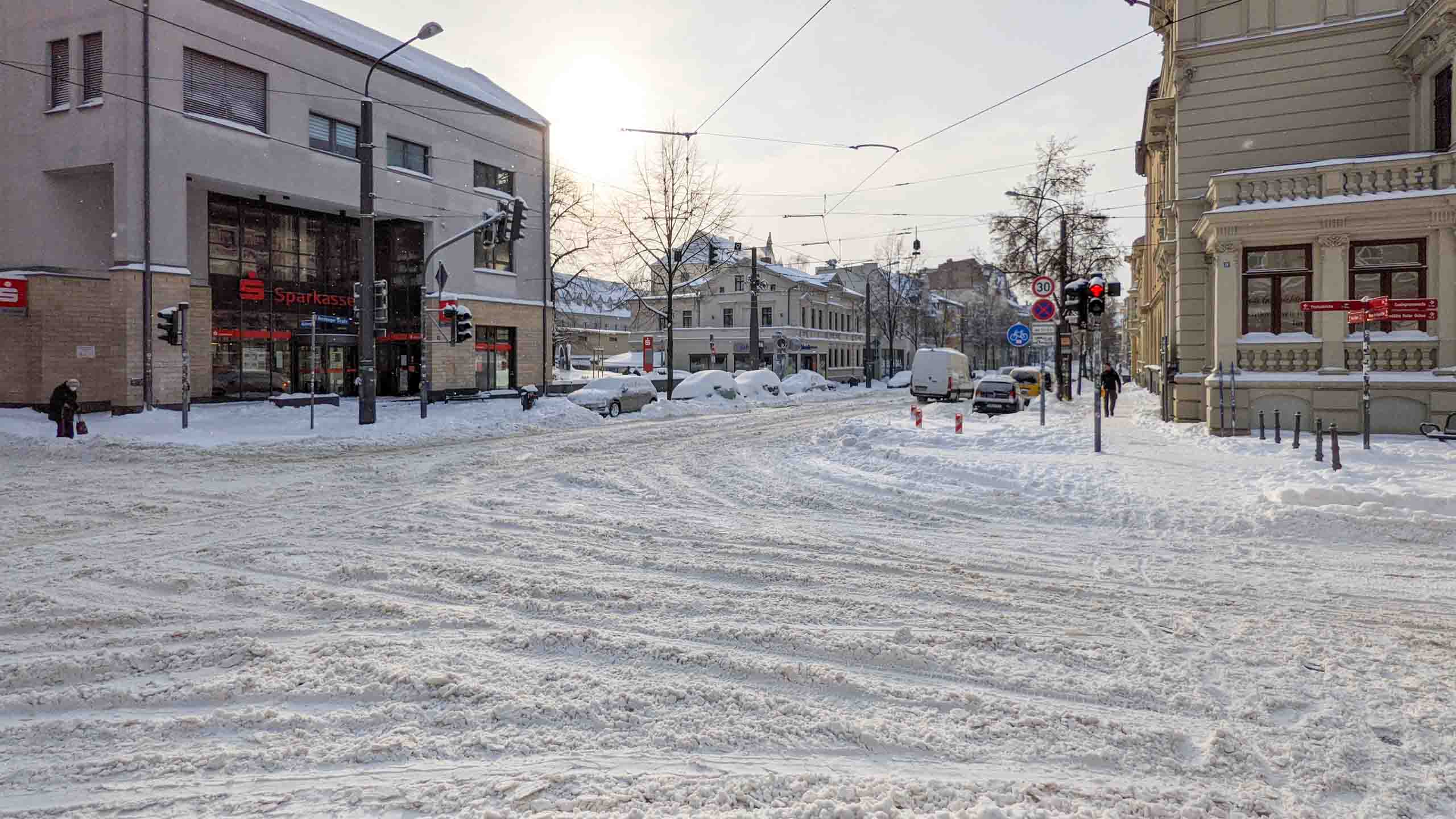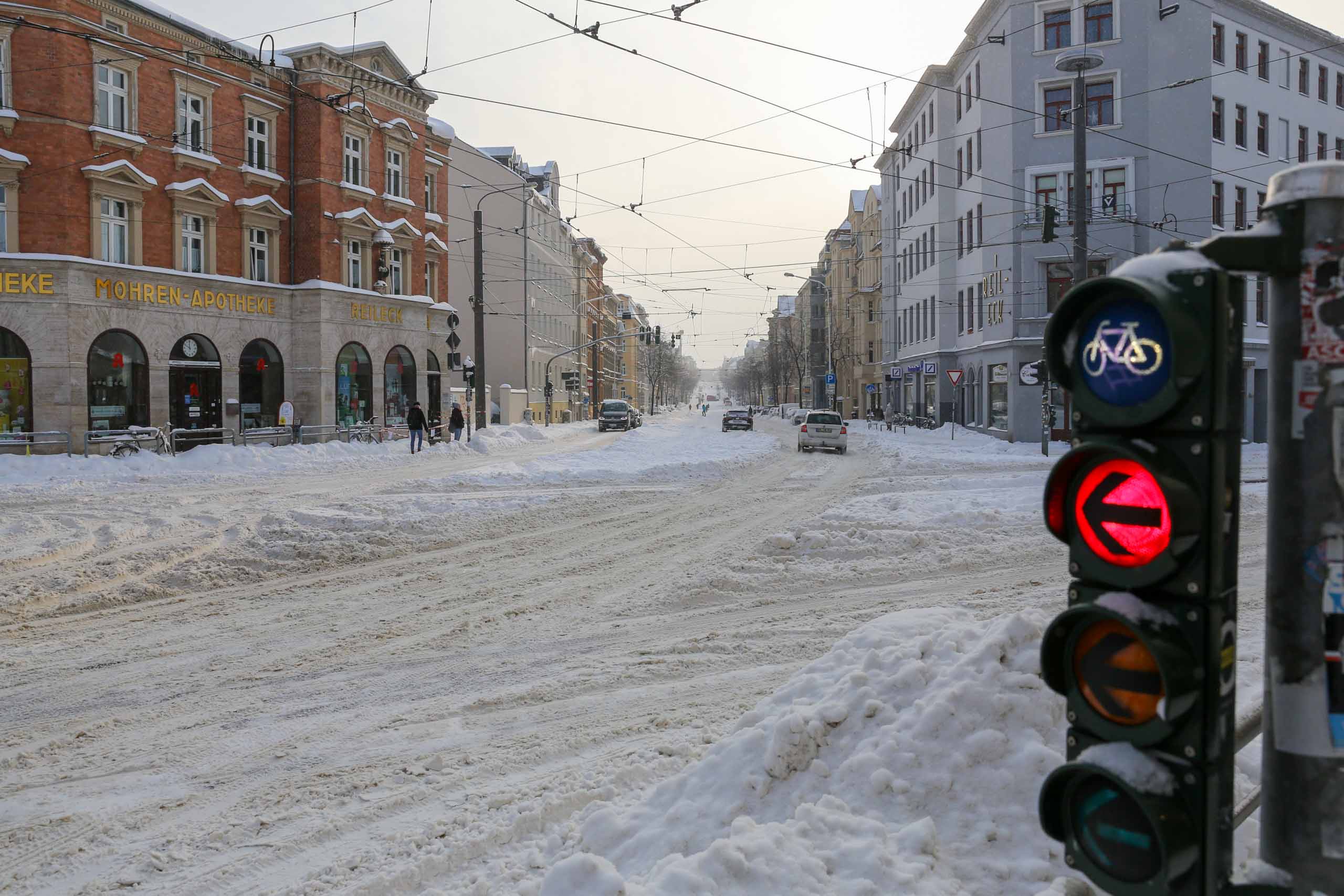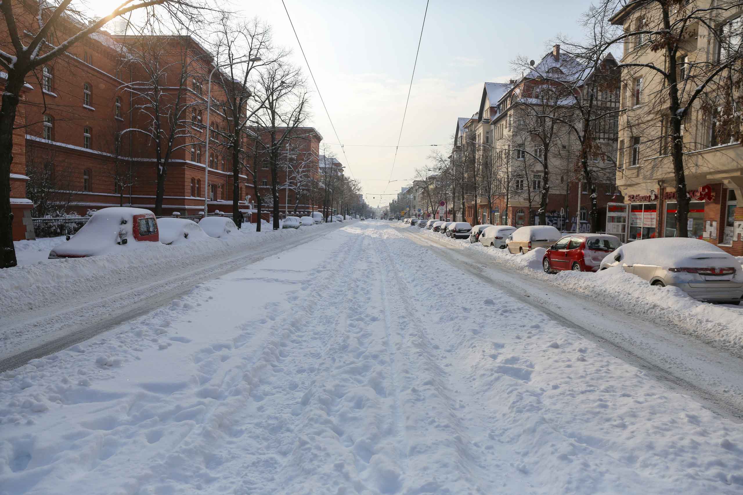 Schließlich zeigte sich tagsüber die Sonne über den verschneiten Straßen Halles und bot einen selten gewordenen Anblick.