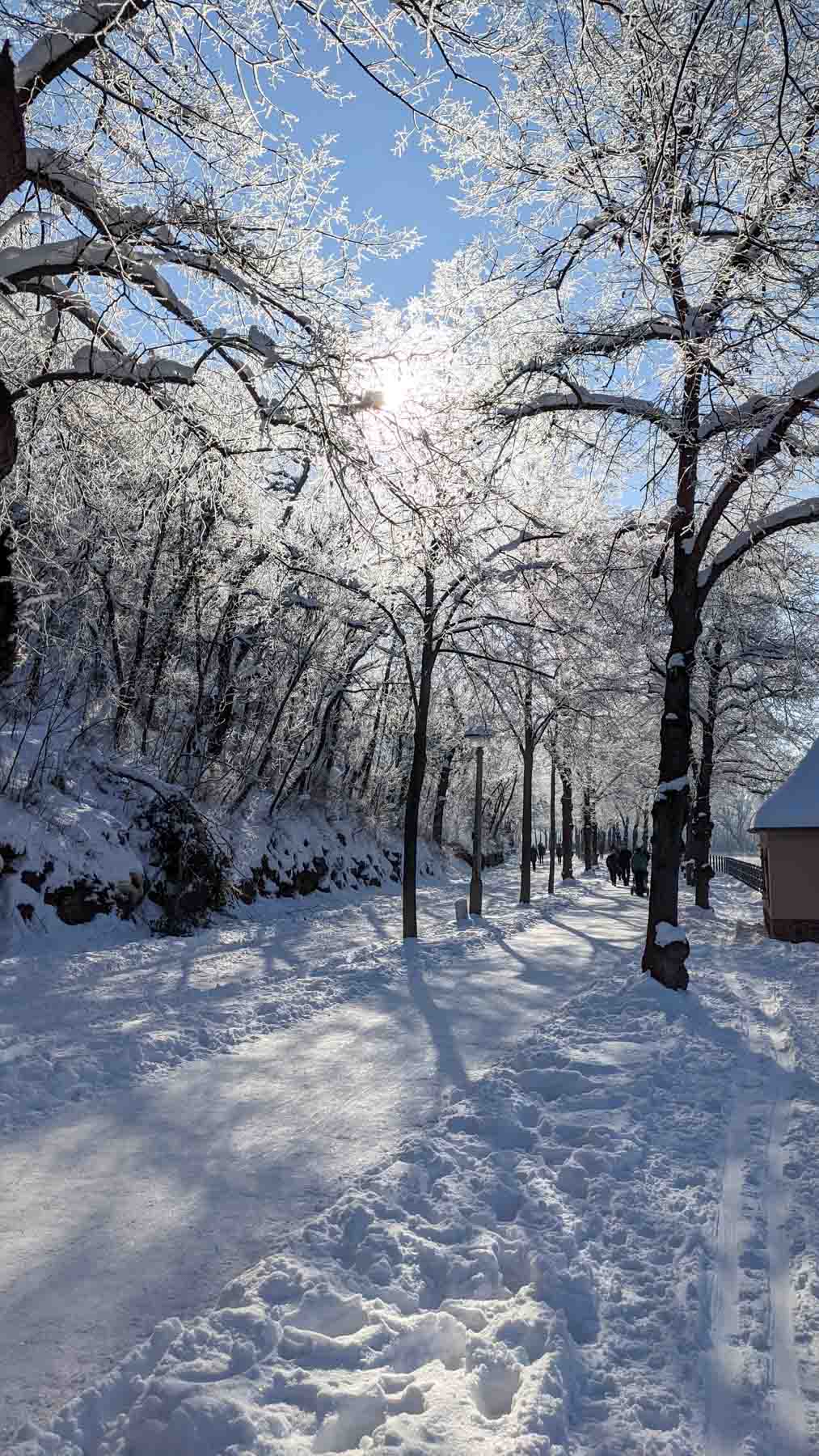 Sonnenschein und durch leichten Nachtnebel gezuckerte Bäume und Sträucher waren märchenhaft verwandelt.