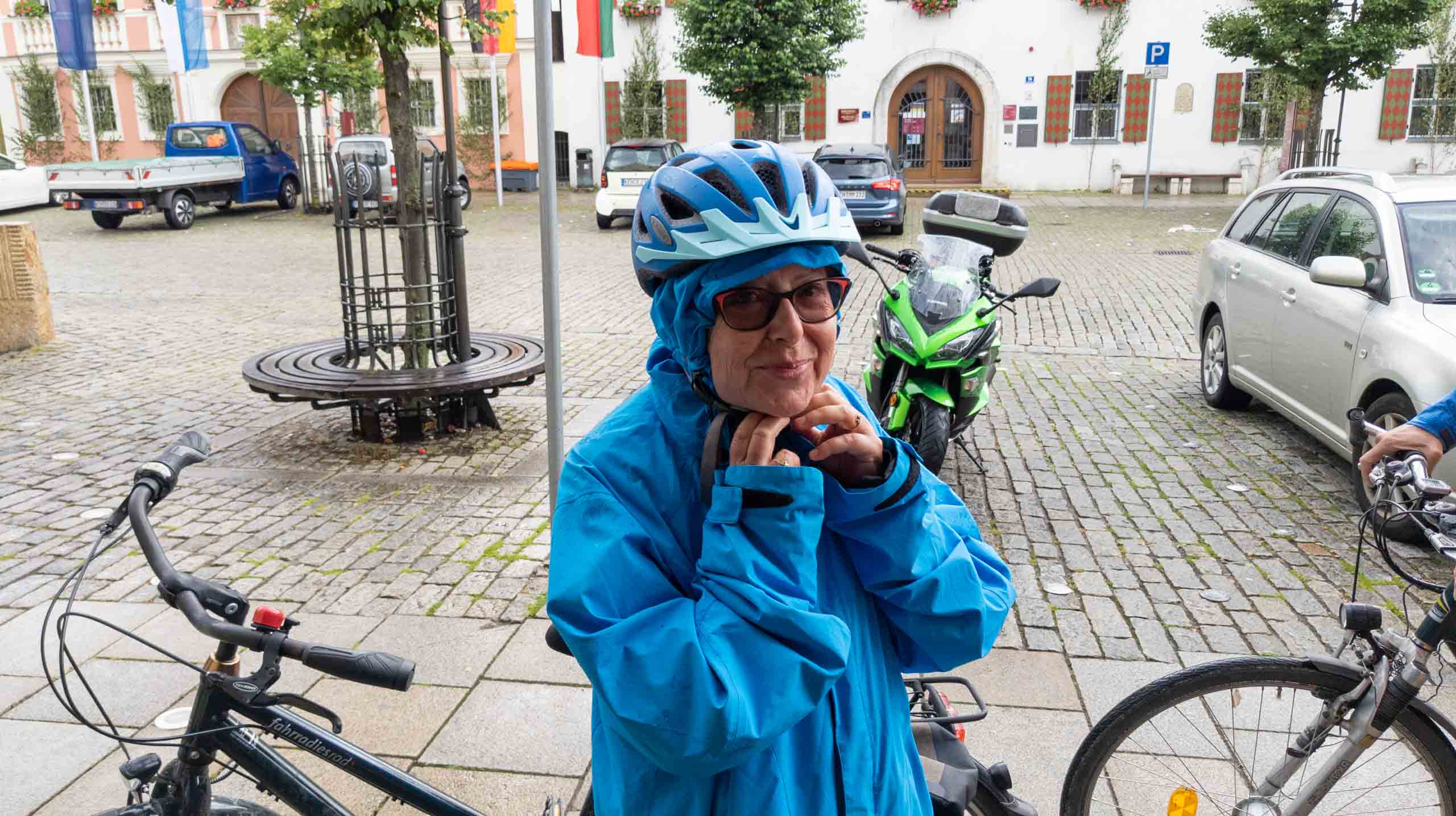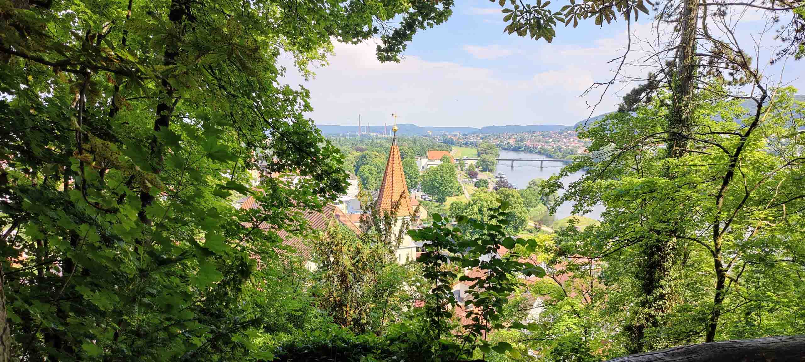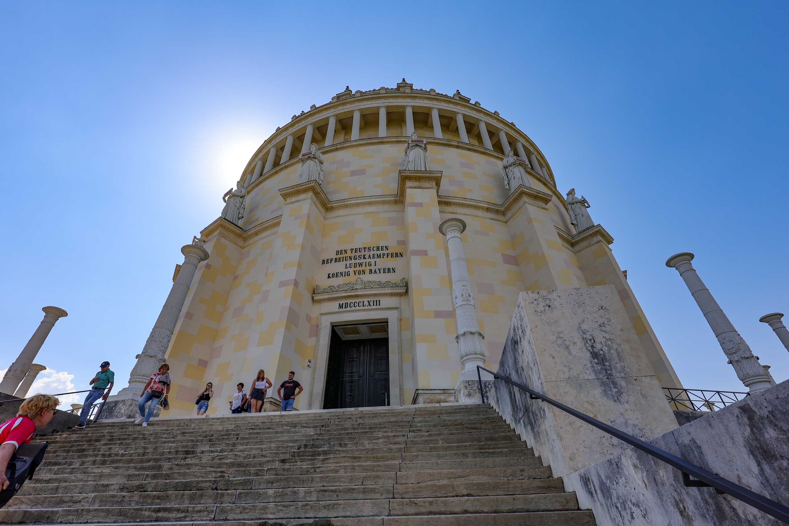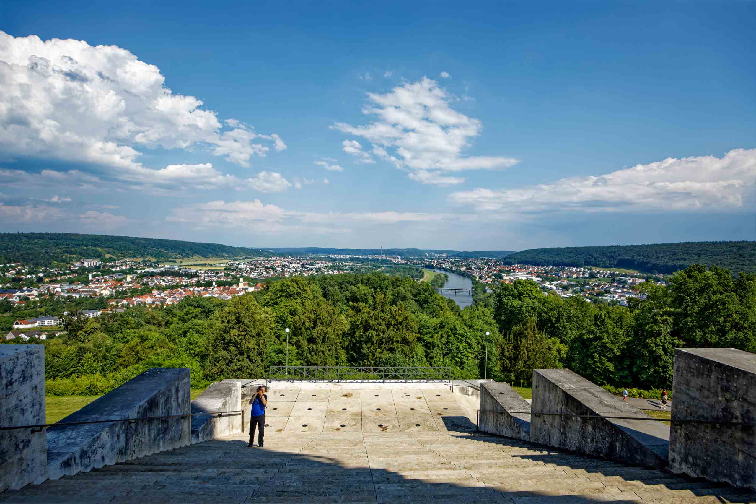 Wieder geht es zunächst an die Altmühl. Ab Dietfurt fließt diese dann im Bett des Main-Donau-Kanal. In Kelheim passieren wir zwischen der Einmündung der Altmühl in die Donau die bekannte Befreiungshalle auf dem Michelberg. Wir verfahren uns auf dem Weg dorthin dank veralteter Kartendaten im Wald und dann beginnt auch noch ein Gewitterregen mit kräftigen Schauern. Wohl dem, der seine Regenjacke nicht im Koffer gelassen sondern mitgenommen hat. Wir verlieren uns zudem noch bei der Suche nach einem geschützen Unterstand und treffen uns schließlich auf dem Markt Kelheim wieder. Und gleich scheint auch wieder die Sonne. Bei Kaffee, Kakao und Kuchen werden die Kalorien aufgefüllt, die Sachen trocknen schnell und uns wird wieder warm. Der fast aufgegeben steile Aufstieg zur Befreiungshalle lohnt dann doch und entschädigt mit vielen schönen Ausblicken.