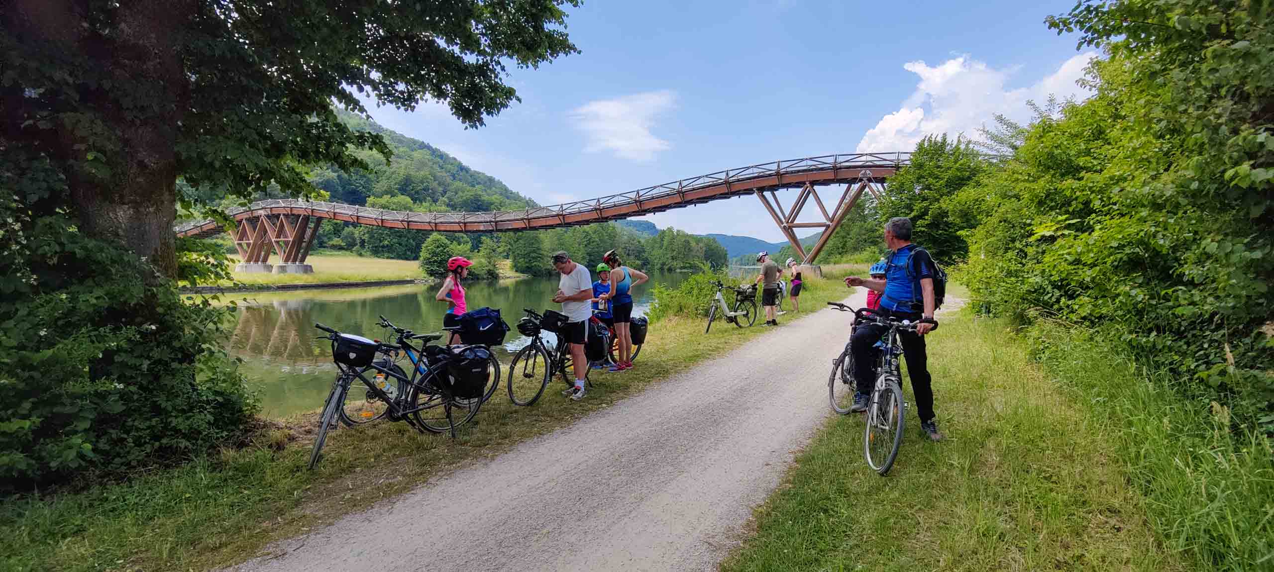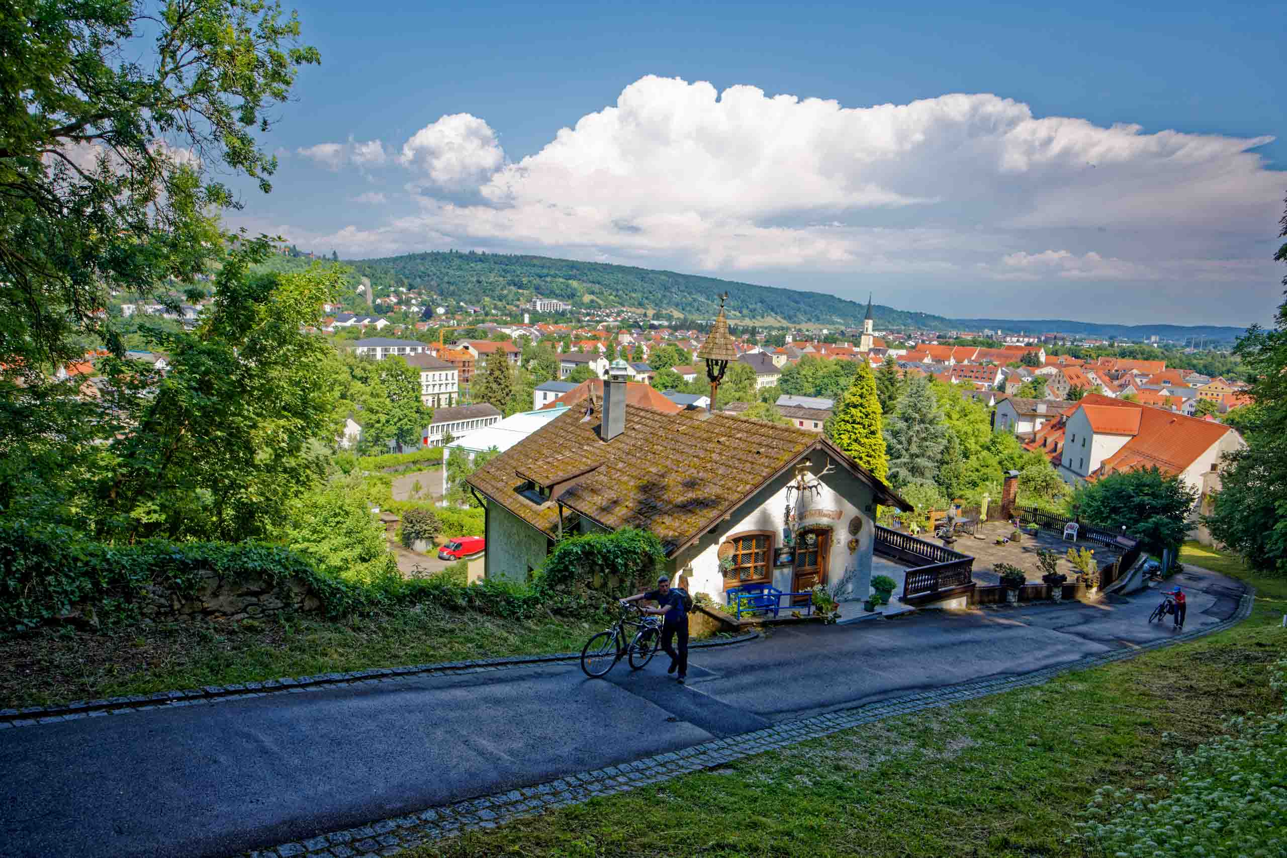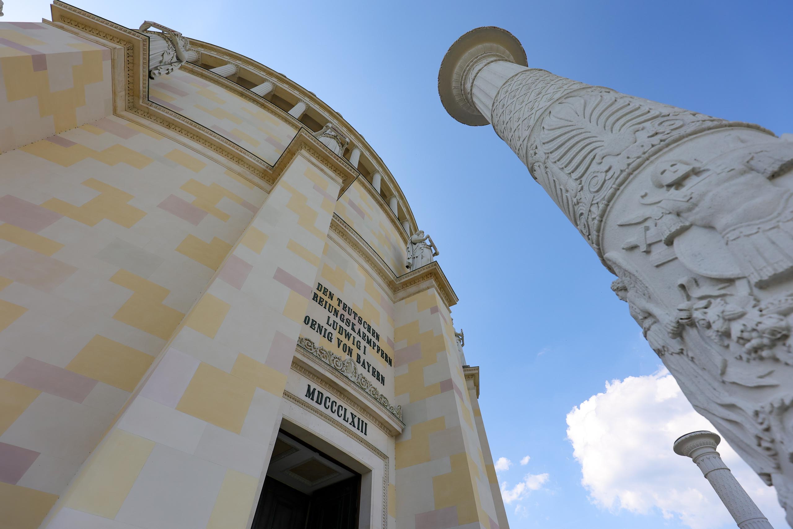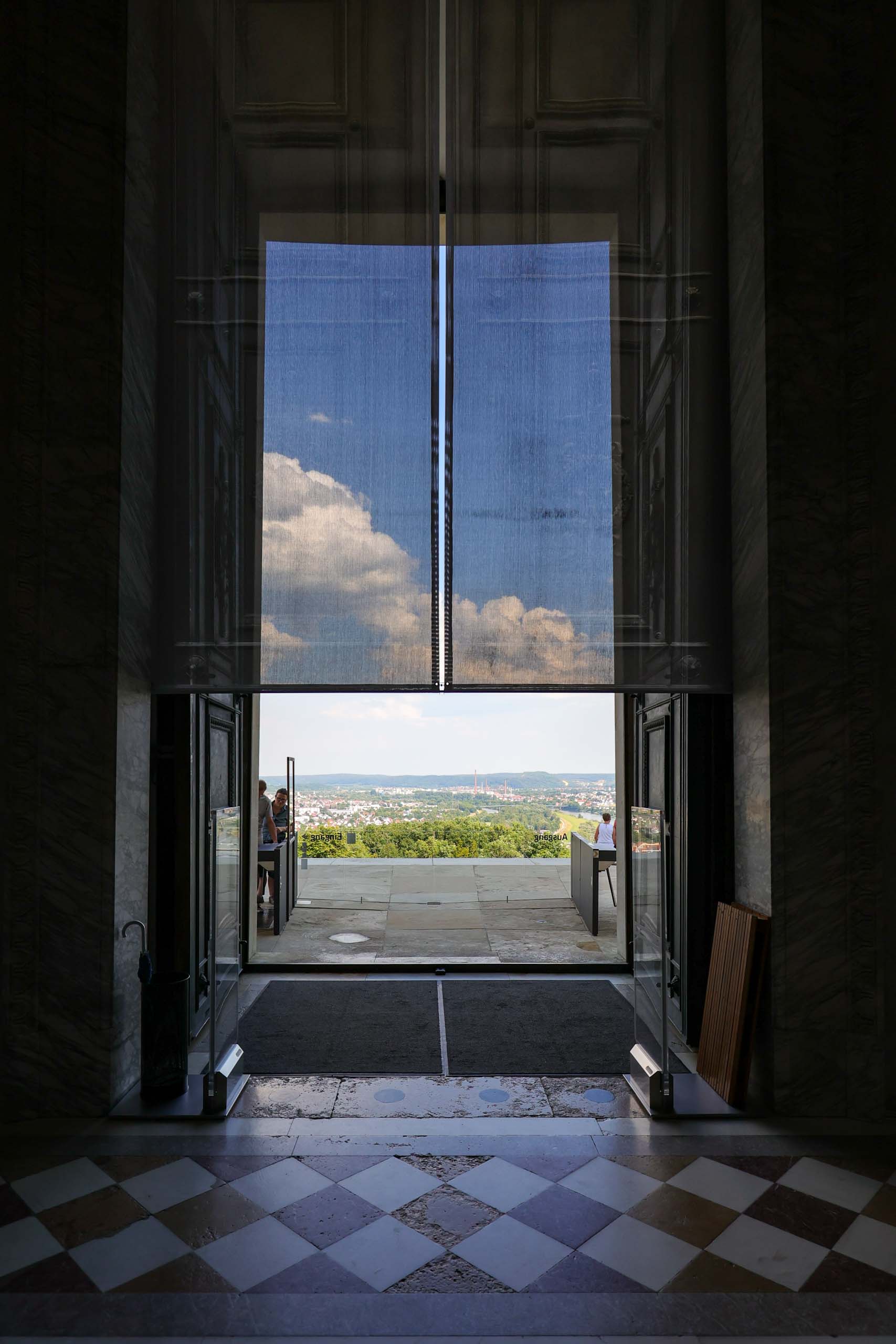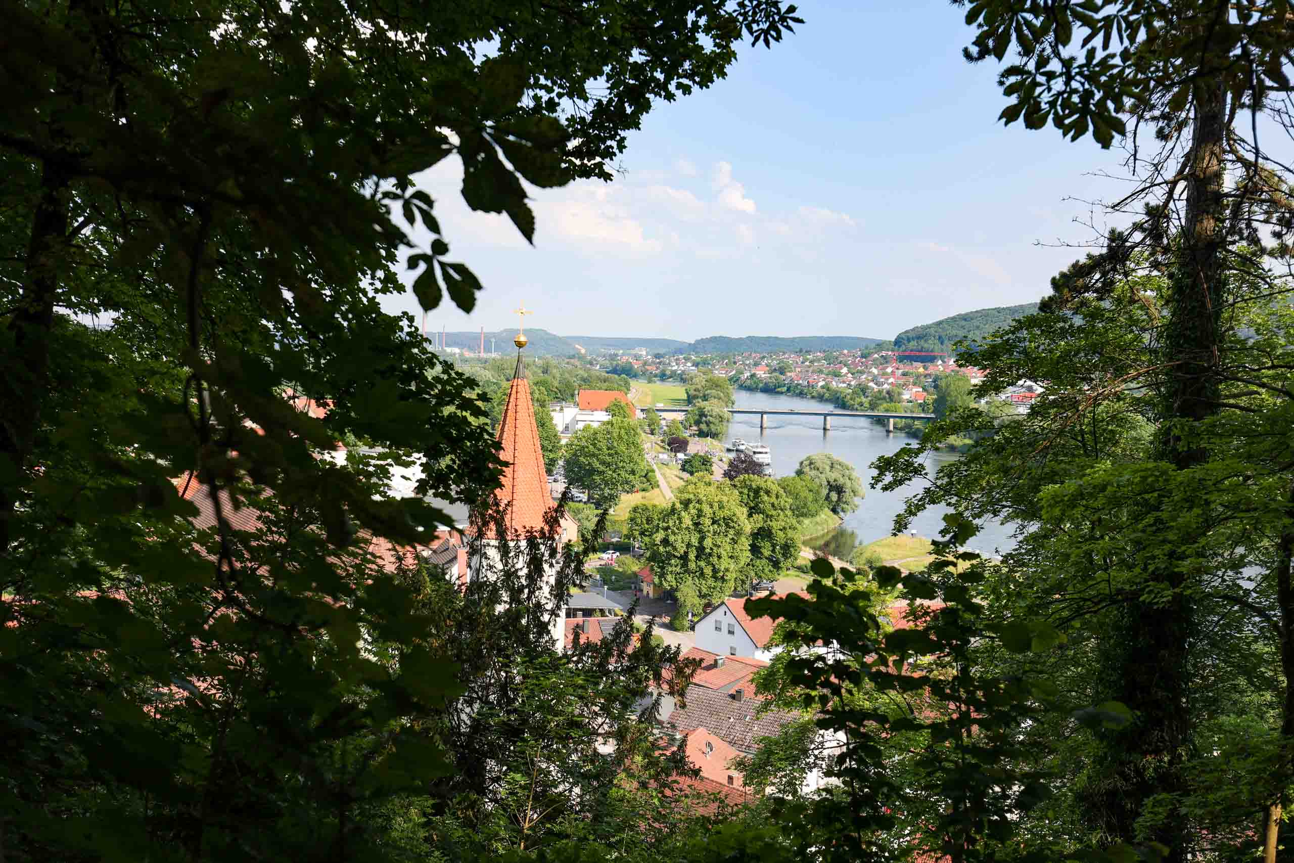 Wieder geht es zunächst an die Altmühl. Ab Dietfurt fließt diese dann im Bett des Main-Donau-Kanal. In Kelheim passieren wir zwischen der Einmündung der Altmühl in die Donau die bekannte Befreiungshalle auf dem Michelberg. Wir verfahren uns auf dem Weg dorthin dank veralteter Kartendaten im Wald und dann beginnt auch noch ein Gewitterregen mit kräftigen Schauern. Wohl dem, der seine Regenjacke nicht im Koffer gelassen sondern mitgenommen hat. Wir verlieren uns zudem noch bei der Suche nach einem geschützen Unterstand und treffen uns schließlich auf dem Markt Kelheim wieder. Und gleich scheint auch wieder die Sonne. Bei Kaffee, Kakao und Kuchen werden die Kalorien aufgefüllt, die Sachen trocknen schnell und uns wird wieder warm. Der fast aufgegeben steile Aufstieg zur Befreiungshalle lohnt dann doch und entschädigt mit vielen schönen Ausblicken.